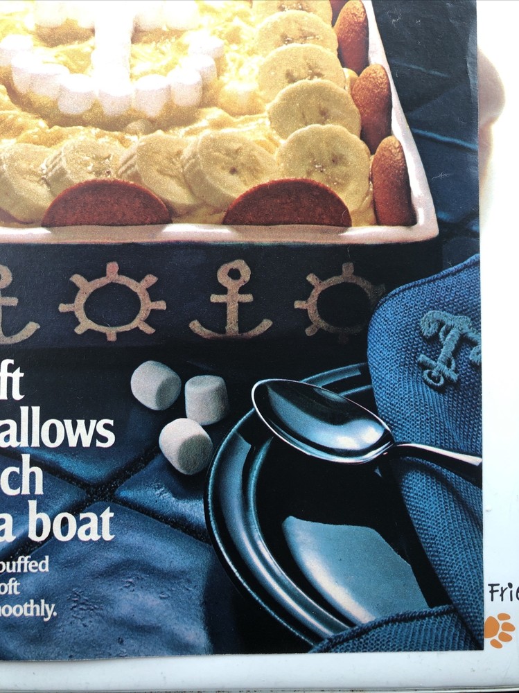 This vintage 1974 print ad features a mouth-watering banana boat dessert recipe using Kraft marshmallows. The colorful ad showcases the Jet-Puffed marshmallows and their versatility in creating delicious desserts. The ad is in great shape and would make a wonderful addition to any food and beverage advertising collection. The ad was originally published in a magazine and is an original piece from the United States. Original approximate 8"x11" vintage magazine print ad.