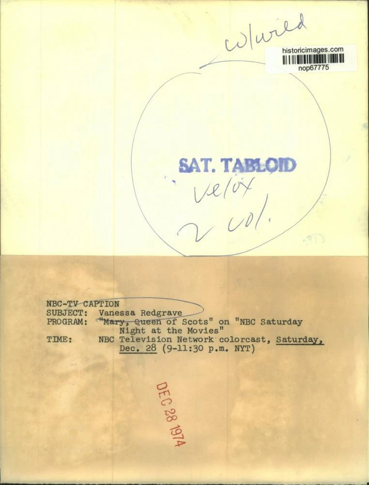 ebay template Note: Please study the images carefully to determine the condition of this vintage photograph, as it may not be in perfect condition. It may contain wrinkles, cracks, and possibly even tears due to its age and how it was handled before it got to us. A scanner may interpret colors and contrast differently than human eyes will, so it is possible that the actual photograph may be slightly darker or lighter in person. This vintage photograph is offered for sale as a collectible item and conveys no transfer of copyright. 1974 Press Photo Vanessa Redgrave in "Mary, Queen of Scots" on NBC - nop67775 This is an original press photo. Vanessa Redgrave stars in "Mary, Queen of Scots," on "NBC Saturday Night at the Movies" on NBC Television Network colorcast, Saturday, December 28 (9-11:30 pm, NYT)Photo measures 7 x 9.25inches. Photo is dated 12-28-1974. PHOTO FRONT PHOTO BACK Historic Images Part Number: nop67775 Sell Smarter with Kyozou. Inventory and Ecommerce Management