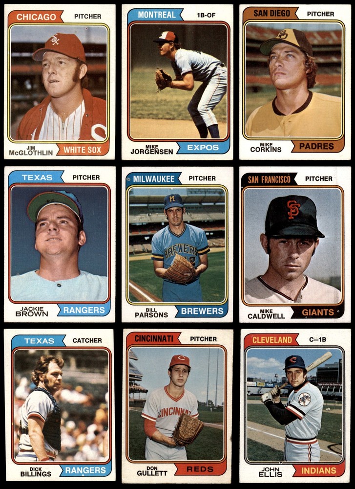 This set contains the following cards 1974 Topps #15 Joe Torre 5 - EX Front Back 1974 Topps #29 Phil Niekro 2 - GOOD Front Back 1974 Topps #46 Pat Kelly 4 - VG/EX Front Back 1974 Topps #59 Ross Grimsley 2 - GOOD Front Back 1974 Topps #64 Doug Rau 2 - GOOD Front Back 1974 Topps #67 Tommy Helms 3 - VG Front Back 1974 Topps #72 Aurelio Rodriguez 2 - GOOD Front Back 1974 Topps #74 Twins Team 6 - EX/MT Front Back 1974 Topps #86 Joe Ferguson 4 - VG/EX Front Back 1974 Topps #87 Fergie Jenkins 3 - VG Front Back 1974 Topps #89 Jackie Brown 4 - VG/EX Front Back 1974 Topps #98 Bert Blyleven 4 - VG/EX Front Back 1974 Topps #122 Jim Holt 4 - VG/EX Front Back 1974 Topps #123 Nelson Briles 3 - VG Front Back 1974 Topps #128 John Ellis 4 - VG/EX Front Back 1974 Topps #134 Denis Menke 2 - GOOD Front Back 1974 Topps #147 Bart Johnson 3 - VG Front Back 1974 Topps #165 Willie Davis 3 - VG Front Back 1974 Topps #189 Jim Brewer 3 - VG Front Back 1974 Topps #208 - John Hiller / Mike Marshall Leading Firemen 2 - GOOD Front Back 1974 Topps #215 Al Kaline 3 - VG Front Back 1974 Topps #236 - Red Schoendienst / Vern Benson / George Kissell / Johnny Lewis / Barney Schultz Cardinals Leaders 3 - VG Front Back 1974 Topps #248 Tom Hall 3 - VG Front Back 1974 Topps #262 Ed Kirkpatrick 4 - VG/EX Front Back 1974 Topps #277 Gary Nolan 2 - GOOD Front Back 1974 Topps #287 Clay Kirby 3 - VG Front Back 1974 Topps #296 Ray Corbin 5 - EX Front Back 1974 Topps #306 - Earl Weaver / George Bamberger / Jim Frey / Billy Hunter / George Staller Orioles Leaders 3 - VG Front Back 1974 Topps #325 Tommy Harper 4 - VG/EX Front Back 1974 Topps #336 - Pete Rose / Bobby Murcer All-Star Left Fielders 2 - GOOD Front Back 1974 Topps #344 Mike Caldwell 4 - VG/EX Front Back 1974 Topps #357 Buddy Bradford 4 - VG/EX Front Back 1974 Topps #385 Don Gullett 2 - GOOD Front Back 1974 Topps #402 Jim Rooker 4 - VG/EX Front Back 1974 Topps #405 Ellie Rodriguez 4 - VG/EX Front Back 1974 Topps #406 Steve Arlin 4 - VG/EX Front Back 1974 Topps #410 Pedro Borbon 3 - VG Front Back 1974 Topps #421 Dan Fife 4 - VG/EX Front Back 1974 Topps #425 Pete Broberg 4 - VG/EX Front Back 1974 Topps #427 Bobby Bolin 5 - EX Front Back 1974 Topps #440 Jim Kaat 2 - GOOD Front Back 1974 Topps #441 Tom Ragland 4 - VG/EX Front Back 1974 Topps #458 Jim Ray 4 - VG/EX Front Back 1974 Topps #459 Reds Team 3 - VG Front Back 1974 Topps #462 Luis Alvarado 3 - VG Front Back 1974 Topps #466 Dick Billings 5 - EX Front Back 1974 Topps #469 Joe Decker 4 - VG/EX Front Back 1974 Topps #472 - Darold Knowles 1973 World Series - Game #1 4 - VG/EX Front Back 1974 Topps #474 - Felix Millan / Bert Campaneris 1973 World Series - Game #3 3 - VG Front Back 1974 Topps #475 - Ray Fosse / Rusty Staub 1973 World Series - Game #4 3 - VG Front Back 1974 Topps #491 Roger Nelson 3 - VG Front Back 1974 Topps #497 Bobby Mitchell 4 - VG/EX Front Back 1974 Topps #498 Pat Corrales 4 - VG/EX Front Back 1974 Topps #500 Lee May 3 - VG Front Back 1974 Topps #506 Ed Farmer 6 - EX/MT Front Back 1974 Topps #514 Paul Schaal 4 - VG/EX Front Back 1974 Topps #516 Horacio Pina 1.5 - FAIR Front Back 1974 Topps #518 Derrel Thomas 4 - VG/EX Front Back 1974 Topps #521 - Ken Aspromonte / Clay Bryant / Tony Pacheco Indians Leaders 4 - VG/EX Front Back 1974 Topps #524 Bill Plummer 3 - VG Front Back 1974 Topps #537 Steve Mingori 4 - VG/EX Front Back 1974 Topps #539 Lloyd Allen 4 - VG/EX Front Back 1974 Topps #541 Indians Team 3 - VG Front Back 1974 Topps #542 Goose Gossage 3 - VG Front Back 1974 Topps #545 Billy Conigliaro 3 - VG Front Back 1974 Topps #546 Mike Corkins 4 - VG/EX Front Back 1974 Topps #549 Mike Jorgensen 4 - VG/EX Front Back 1974 Topps #554 Tim Johnson 5 - EX Front Back 1974 Topps #556 Dave Campbell 3 - VG Front Back 1974 Topps #557 Jim McGlothlin 4 - VG/EX Front Back 1974 Topps #559 Darrel Chaney 2 - GOOD Front Back 1974 Topps #565 Milt Wilcox 5 - EX Front Back 1974 Topps #572 Enzo Hernandez 2 - GOOD Front Back 1974 Topps #574 Bill Parsons 4 - VG/EX Front Back 1974 Topps #579 Cecil Upshaw 4 - VG/EX Front Back 1974 Topps #581 Fred Norman 2 - GOOD Front Back 1974 Topps #585 Merv Rettenmund 4 - VG/EX Front Back 1974 Topps #591 Sonny Jackson 4 - VG/EX Front Back 1974 Topps #593 Steve Yeager 3 - VG Front Back 1974 Topps #594 Leroy Stanton 3 - VG Front Back 1974 Topps #613 Dan Monzon 4 - VG/EX Front Back 1974 Topps #614 Adrian Devine 4 - VG/EX Front Back 1974 Topps #617 Ted Ford 4 - VG/EX Front Back 1974 Topps #618 Jim Mason 3 - VG Front Back 1974 Topps #622 Phil Gagliano 3 - VG Front Back 1974 Topps #623 Celerino Sanchez 5 - EX Front Back 1974 Topps #624 Bob Miller 2 - GOOD Front Back 1974 Topps #625 Ollie Brown 4 - VG/EX Front Back 1974 Topps #627 Carl Taylor 4 - VG/EX Front Back 1974 Topps #628 Ivan Murrell 3 - VG Front Back 1974 Topps #633 Dave Hamilton 3 - VG Front Back 1974 Topps #634 - Eddie Mathews / Jim Busby / Connie Ryan / Ken Silvestri / Herm Starrette Braves Leaders 3 - VG Front Back 1974 Topps #639 Joe Lovitto 3 - VG Front Back 1974 Topps #641 Chuck Brinkman 5 - EX Front Back 1974 Topps #644 Wayne Granger 4 - VG/EX Front Back 1974 Topps #648 Terry Crowley 5 - EX Front Back 1974 Topps #651 Leron Lee 3 - VG Front Back 1974 Topps #652 Gail Hopkins 4 - VG/EX Front Back 1974 Topps #656 Adrian Garrett 5 - EX Front Back 1974 Topps #658 Lee Lacy 4 - VG/EX Front Back This 1974 Topps 100 Card Starter Set / Lot is a great way to start collecting the 1974 Topps Set and contains no duplicate cards. Set breakdown by grade: Number of Cards in Set 100 Average Grade - Weighted by Value 3.55 - VG+ Average Grade - Unweighted 3.52 - VG+ Grade Breakdown 6 - EX/MT 2 5 - EX 10 4 - VG/EX 41 3 - VG 32 2 - GOOD 14 1.5 - FAIR 1 . Dean's Cards offers a 100% Money Back Satisfaction Guarantee on all purchases. Just contact us within 10 days of the purchase date and we will refund your money or, when possible, replace the cards. 1974 Topps 100 Card Starter Set / Lot 3.5 - VG+ 6909638 If the scan in the listing says ACTUAL IMAGE, you will receive