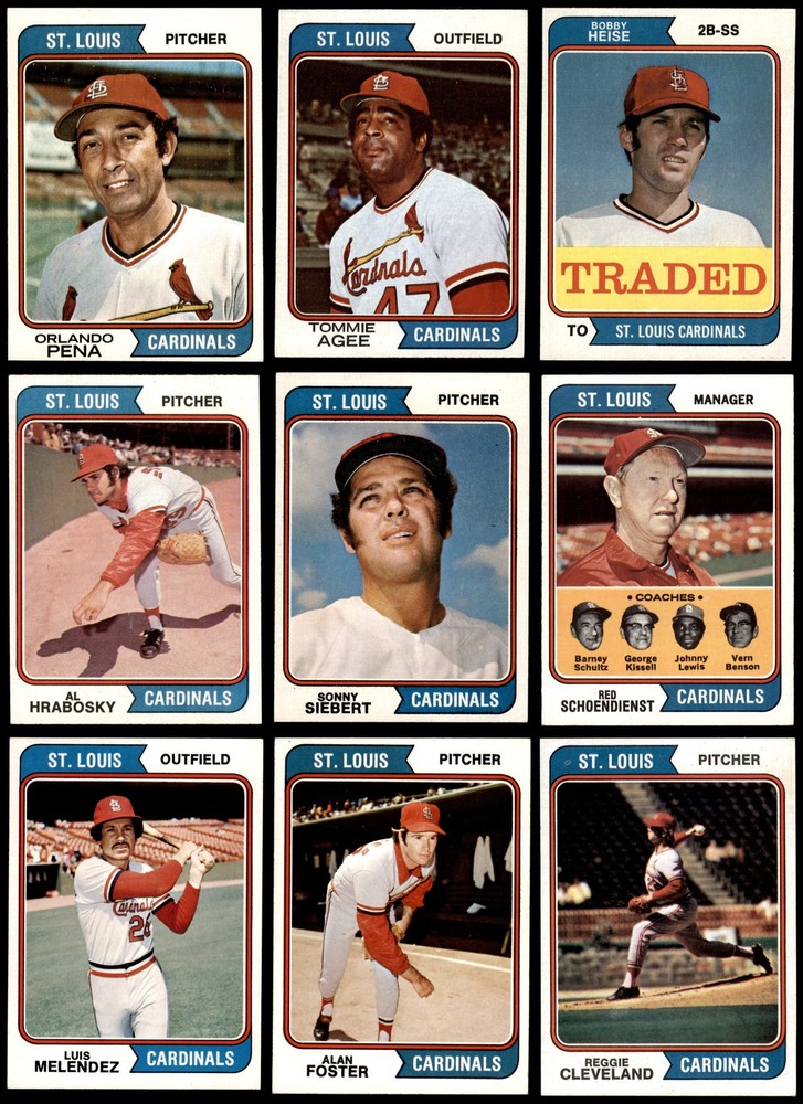 This set contains the following cards 1974 Topps #15 Joe Torre 7 - NM Front Back 1974 Topps Traded #51 T - Bob Heise Traded 7 - NM Front Back 1974 Topps #60 Lou Brock 6 - EX/MT Front Back 1974 Topps #108 Al Hrabosky 7 - NM Front Back 1974 Topps #151 Diego Segui 7 - NM Front Back 1974 Topps #175 Reggie Cleveland 7 - NM Front Back 1974 Topps #236 - Red Schoendienst / Vern Benson / George Kissell / Johnny Lewis / Barney Schultz Cardinals Leaders 6 - EX/MT Front Back 1974 Topps #260 Ted Simmons 6 - EX/MT Front Back 1974 Topps #285 Reggie Smith 7 - NM Front Back 1974 Topps #307 Luis Melendez 7 - NM Front Back 1974 Topps Traded #348 T - Pete Richert Traded 7 - NM Front Back 1974 Topps #372 Ken Reitz 8 - NM/MT Front Back 1974 Topps Traded #373 T - John Curtis Traded 7 - NM Front Back 1974 Topps #393 Orlando Pena 7 - NM Front Back 1974 Topps #417 Rich Folkers 6 - EX/MT Front Back 1974 Topps #442 Alan Foster 7 - NM Front Back 1974 Topps #464 Jose Cruz 7 - NM Front Back 1974 Topps #496 Tom Murphy 7 - NM Front Back 1974 Topps #520 Tim McCarver 6 - EX/MT Front Back 1974 Topps #548 Sonny Siebert 7 - NM Front Back 1974 Topps #576 Scipio Spinks 7 - NM Front Back 1974 Topps #601 - Bake McBride / Brian Downing / Ed Armbrister / Rich Bladt Rookie Outfielders 7 - NM Front Back 1974 Topps #630 Tommie Agee 6 - EX/MT Front Back 1974 Topps #655 Mike Tyson 6 - EX/MT Front Back This is a 1974 Topps St. Louis Cardinals Near Team Set. Dean's Cards has designed our Near Complete Team Sets using the majority of cards for that team - leaving out the expensive super-star rookie cards, high numbers, short-prints, and multi-player rookie cards, reducing the price. the other cards can then be added, from our inventory of over a million cards, as your budget allows. For the exact cards contained in this set, as well as their front and back scans, please see the description below. Set breakdown by grade: Number of Cards in Set 24 Average Grade - Weighted by Value 6.81 - NM Average Grade - Unweighted 6.75 - NM Grade Breakdown 8 - NM/MT 1 7 - NM 16 6 - EX/MT 7 . This near team set contains 24 cards out of the possible 32 cards. This is not a complete set. This set does not include the following cards: St. Louis Cardinals Red Team Checklist, #36 Cardinals Team, #204 SB Leaders - Tommy Harper / Lou Brock, #209 Ted Sizemore, #339 All-Star Pitchers - Catfish Hunter / Rick Wise, #350 Bob Gibson, #604 Rookie Infielders - Frank White / Andre Thornton / Terry Hughes / John Knox, #607 Rookie Shortstops - Frank Taveras / Leo Foster / Tom Heintzelman / Dave Rosello Dean's Cards offers a 100% Money Back Satisfaction Guarantee on all purchases. Just contact us within 10 days of the purchase date and we will refund your money or, when possible, replace the cards. 1974 Topps St. Louis Cardinals Near Team Set 7 - NM 6909895 (24 / 32 cards) If the scan in the listing says ACTUAL IMAGE, you will receive the card pictured. For cards issued after 1983, we will often use representative images and you will not receive the exact card pictured. Shipping Policy You only pay shipping on the first item. If you order multiple items on the same order, you will only be charged once for shipping. We do not combine shipping on multiple orders. To avoid multiple shipping charges we recommend using eBay's "Add to Cart" feature to check out multiple items in one transaction, or please request and allow for us to send an invoice to reflect the combined shipping charges. Canadian customers - We send all of our Canadian/International packages with tracking and cannot make any exceptions to this policy. Negotiating Prices All prices are final and we do not negotiate. This policy is to ensure that everyone knows that they are getting our best possible price. So please do not ask us to negotiate on price. Return Policy Dean's Cards has a 100% Money Back Satisfaction Guarantee on all purchases, as long as the product is returned within 30 days of receiving the product. Card Grading Each card is first reviewed by a member of our team, in order to detect any flaws that may not be visible on a scan, such as wrinkles, creases, print spots, or light stains. The vast majority of our vintage cards are professionally graded by the Dean's Cards Grading Software and include a 100% satisfaction guarantee. Our grading is on par with PSA standards when it comes to corners, centering and flaws - and tends to grade a bit tougher than PSA, on cards with a tilted image or rough edges. This grading software was developed to provide far better grading and consistency than can be achieved using the human eye. Determining the card's grade The sharpness of the corners and the degree to which a card was cut off-center determines the maximum possible grade that the card can receive. The card's grade is further reduced by any flaws or blemishes that it may have. Each card is evaluated on the following characteristics and assigned a score. Corners - Each corner of a card is individually analyzed, and then assigned a score on how square, sharp, and flawless it appears. Centering - The borders are measured, at multiple points along the edge, to determine the horizontal and vertical centering and tilt. Defects - The card is examined for imperfections, such as: size, print flaws, dings, stains, creases, or other wear which could lower its grade. Bonus for Perfect Centering - A vintage card, with near perfect centering, is given a one-half grade bonus. So when you buy one of our cards with a half-grade (e.g. 3.5 or 6.5) it will appear perfectly centered, both vertically and horizontally. Grading Criteria Worst Corner - A card can grade only as high as the worst corner will allow. Average Corner Tilt - The difference in width of a card border near the top, compared to the bottom. OCT - The sum of how far a card is Off-Center, plus its Tilt. Minimum Centering Requirements Eye Appeal - The combination of a card's centering, corners and tilt. Well-Centered - Cards that appear perfectly centered recei