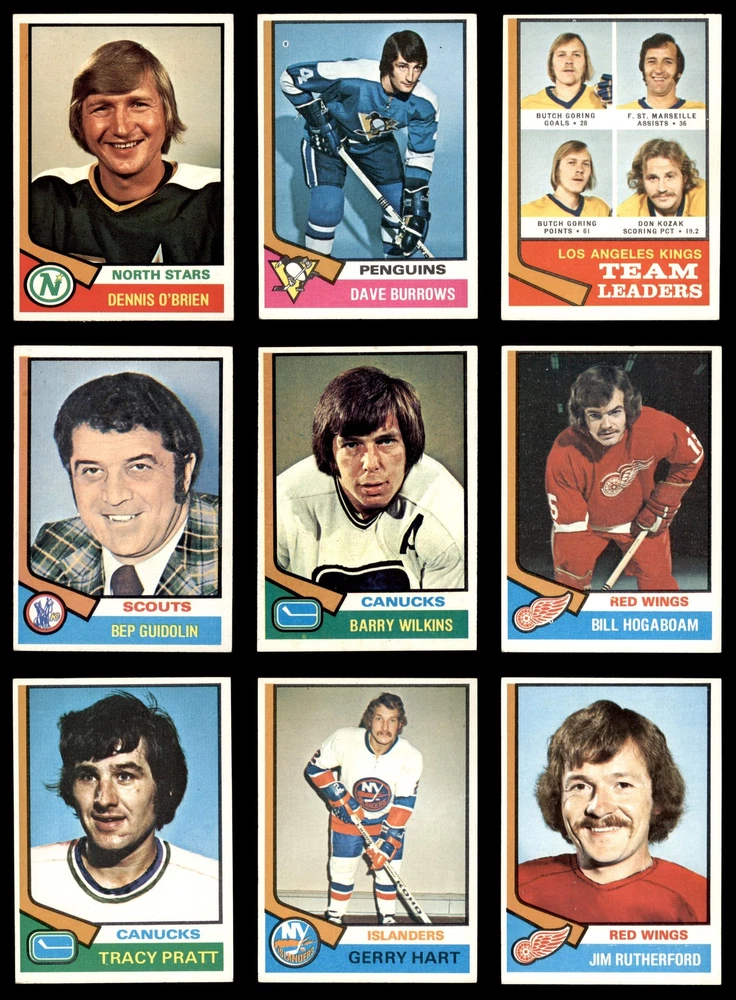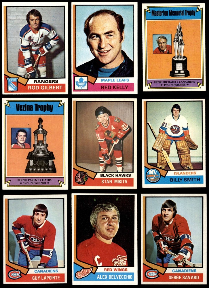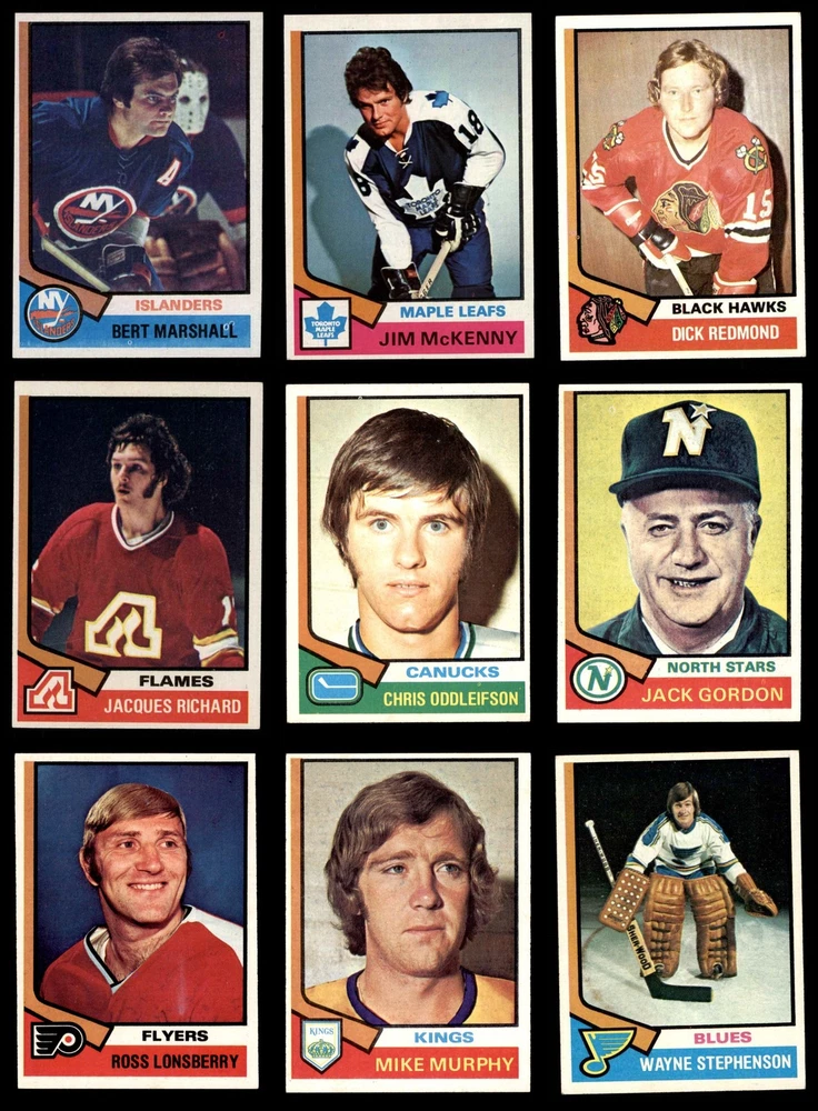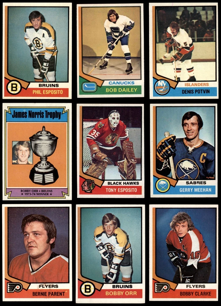 This set contains the following cards 1974 Topps #1 - Phil Esposito / Bill Goldsworthy Goals Leaders 5 - EX Front Back 1974 Topps #2 - Bobby Orr / Dennis Hextall Assists Leaders 4 - VG/EX Front Back 1974 Topps #3 - Phil Esposito / Bobby Clarke Scoring Leaders 5 - EX Front Back 1974 Topps #4 - Doug Favell / Bernie Parent Goals Against Leaders 5 - EX Front Back 1974 Topps #5 - Bryan Watson / Dave Schultz Penalty Minute Leaders 7 - NM Front Back 1974 Topps #6 - Mickey Redmond / Rick MacLeish Power Play Goal Leaders 6 - EX/MT Front Back 1974 Topps #7 Gary Bromley 5 - EX Front Back 1974 Topps #8 Bill Barber 5 - EX Front Back 1974 Topps #9 Emile Francis 5 - EX Front Back 1974 Topps #10 Gilles Gilbert 5 - EX Front Back 1974 Topps #11 John Davidson 6 - EX/MT Front Back 1974 Topps #12 Ron Ellis 5 - EX Front Back 1974 Topps #13 Syl Apps 5 - EX Front Back 1974 Topps #14 - Jacques Richard / Tom Lysiak / Keith McCreary Flames Leaders 5 - EX Front Back 1974 Topps #15 Dan Bouchard 6 - EX/MT Front Back 1974 Topps #16 Ivan Boldirev 5 - EX Front Back 1974 Topps #17 Gary Coalter 4 - VG/EX Front Back 1974 Topps #18 Bob Berry 5 - EX Front Back 1974 Topps #19 Red Berenson 6 - EX/MT Front Back 1974 Topps #20 Stan Mikita 5 - EX Front Back 1974 Topps #21 Fred Shero 6 - EX/MT Front Back 1974 Topps #22 Gary Smith 5 - EX Front Back 1974 Topps #23 Bill Mikkelson 5 - EX Front Back 1974 Topps #24 Jacques Lemaire 3 - VG Front Back 1974 Topps #25 Gilbert Perreault 5 - EX Front Back 1974 Topps #26 Cesare Maniago 5 - EX Front Back 1974 Topps #27 Bobby Schmautz 5 - EX Front Back 1974 Topps #28 - Phil Esposito / Bobby Orr / Johnny Bucyk Bruins Leaders 6 - EX/MT Front Back 1974 Topps #29 Steve Vickers 5 - EX Front Back 1974 Topps #30 Lowell MacDonald 6 - EX/MT Front Back 1974 Topps #31 Fred Stanfield 6 - EX/MT Front Back 1974 Topps #32 Ed Westfall 6 - EX/MT Front Back 1974 Topps #33 Curt Bennett 5 - EX Front Back 1974 Topps #34 Bep Guidolin 5 - EX Front Back 1974 Topps #35 Cliff Koroll 5 - EX Front Back 1974 Topps #36 Gary Croteau 4 - VG/EX Front Back 1974 Topps #37 Mike Corrigan 5 - EX Front Back 1974 Topps #38 Henry Boucha 4 - VG/EX Front Back 1974 Topps #39 Ron Low 5 - EX Front Back 1974 Topps #40 Darryl Sittler 6 - EX/MT Front Back 1974 Topps #41 Tracy Pratt 5 - EX Front Back 1974 Topps #42 - Richard Martin / Rene Robert Sabres Leaders 5 - EX Front Back 1974 Topps #43 Larry Carriere 6 - EX/MT Front Back 1974 Topps #44 Gary Dornhoefer 3 - VG Front Back 1974 Topps #45 Denis Herron 6 - EX/MT Front Back 1974 Topps #46 Doug Favell 6 - EX/MT Front Back 1974 Topps #47 Dave Gardner 5 - EX Front Back 1974 Topps #48 Morris Mott 5 - EX Front Back 1974 Topps #49 Marc Boileau 6 - EX/MT Front Back 1974 Topps #50 Brad Park 5 - EX Front Back 1974 Topps #51 Bob Leiter 5 - EX Front Back 1974 Topps #52 Tom Reid 5.5 - EX+ Front Back 1974 Topps #53 Serge Savard 6 - EX/MT Front Back 1974 Topps #54 Checklist PSA 7 - NM Front Back 1974 Topps #55 Terry Harper 5.5 - EX+ Front Back 1974 Topps #56 - Joey Johnston / Walt McKechnie Seals Leaders 5 - EX Front Back 1974 Topps #57 Guy Charron 6 - EX/MT Front Back 1974 Topps #58 Pit Martin 5 - EX Front Back 1974 Topps #59 Chris Evans 5 - EX Front Back 1974 Topps #60 Bernie Parent 5.5 - EX+ Front Back 1974 Topps #61 Jim Lorentz 5 - EX Front Back 1974 Topps #62 Dave Kryshow 5 - EX Front Back 1974 Topps #63 Lou Angotti 5 - EX Front Back 1974 Topps #64 Bill Flett 5 - EX Front Back 1974 Topps #65 Vic Hadfield 5 - EX Front Back 1974 Topps #66 Wayne Merrick 4 - VG/EX Front Back 1974 Topps #67 Andre Dupont 4 - VG/EX Front Back 1974 Topps #68 Tom Lysiak 5 - EX Front Back 1974 Topps #69 - Jim Pappin / Stan Mikita / J.P. Bordeleau Blackhawks Leaders 5 - EX Front Back 1974 Topps #70 Guy Lapointe 5 - EX Front Back 1974 Topps #71 Gerry O'Flaherly 5 - EX Front Back 1974 Topps #72 Marcel Dionne 6 - EX/MT Front Back 1974 Topps #73 Butch Deadmarsh 5 - EX Front Back 1974 Topps #74 Butch Goring 5 - EX Front Back 1974 Topps #75 Keith Magnuson 5 - EX Front Back 1974 Topps #76 Red Kelly 5 - EX Front Back 1974 Topps #77 Pete Stemkowski 6 - EX/MT Front Back 1974 Topps #78 Jim Roberts 5 - EX Front Back 1974 Topps #79 Don Luce 5 - EX Front Back 1974 Topps #80 Don Awrey 7 - NM Front Back 1974 Topps #81 Rick Kehoe 5 - EX Front Back 1974 Topps #82 Billy Smith 6 - EX/MT Front Back 1974 Topps #83 Jean Parise 4 - VG/EX Front Back 1974 Topps #84 - Mickey Redmond / Marcel Dionne / Bill Hogaboam Red Wings Leaders 5 - EX Front Back 1974 Topps #85 Ed Van Impe 6 - EX/MT Front Back 1974 Topps #86 Randy Manery 5 - EX Front Back 1974 Topps #87 Barclay Plager 5 - EX Front Back 1974 Topps #88 Inge Hammarstrom 6 - EX/MT Front Back 1974 Topps #89 Ab DeMarco 5 - EX Front Back 1974 Topps #90 Bill White 6.5 - EX/MT+ Front Back 1974 Topps #91 Al Arbour 4 - VG/EX Front Back 1974 Topps #92 Bob Stewart 5 - EX Front Back 1974 Topps #93 Jack Egers 6 - EX/MT Front Back 1974 Topps #94 Don Lever 5 - EX Front Back 1974 Topps #95 Reggie Leach 5.5 - EX+ Front Back 1974 Topps #96 Dennis O'Brien 5 - EX Front Back 1974 Topps #97 Peter Mahovlich 5 - EX Front Back 1974 Topps #98 - Butch Goring / Frank St. Marseille / Don Kozak Kings Leaders 5 - EX Front Back 1974 Topps #99 Gerry Meehan 5 - EX Front Back 1974 Topps #100 Bobby Orr 5 - EX Front Back 1974 Topps #101 Jean Potvin 5 - EX Front Back 1974 Topps #102 Rod Seiling 6 - EX/MT Front Back 1974 Topps #103 Keith McCreary 5 - EX Front Back 1974 Topps #104 Phil Maloney 6 - EX/MT Front Back 1974 Topps #105 Denis Dupere 5 - EX Front Back 1974 Topps #106 Steve Durbano 5 - EX Front Back 1974 Topps #107 Bob Plager 5 - EX Front Back 1974 Topps #108 Chris Oddleifson 5 - EX Front Back 1974 Topps #109 Jim Neilson 5 - EX Front Back 1974 Topps #110 Jean Pronovost 5 - EX Front Back 1974 Topps #111 Don Kozak 5 - EX Front Back 1974 Topps #112 - Bill Goldsworthy / Dennis Hextall / Danny Grant North Stars Leaders 5 - EX Front Back 1974 Topps #113 Jim Pappin 6 - EX/MT Front Back 1974 Topps #114 Richard Lemieux 5 - EX Front Back 1974 Topps
