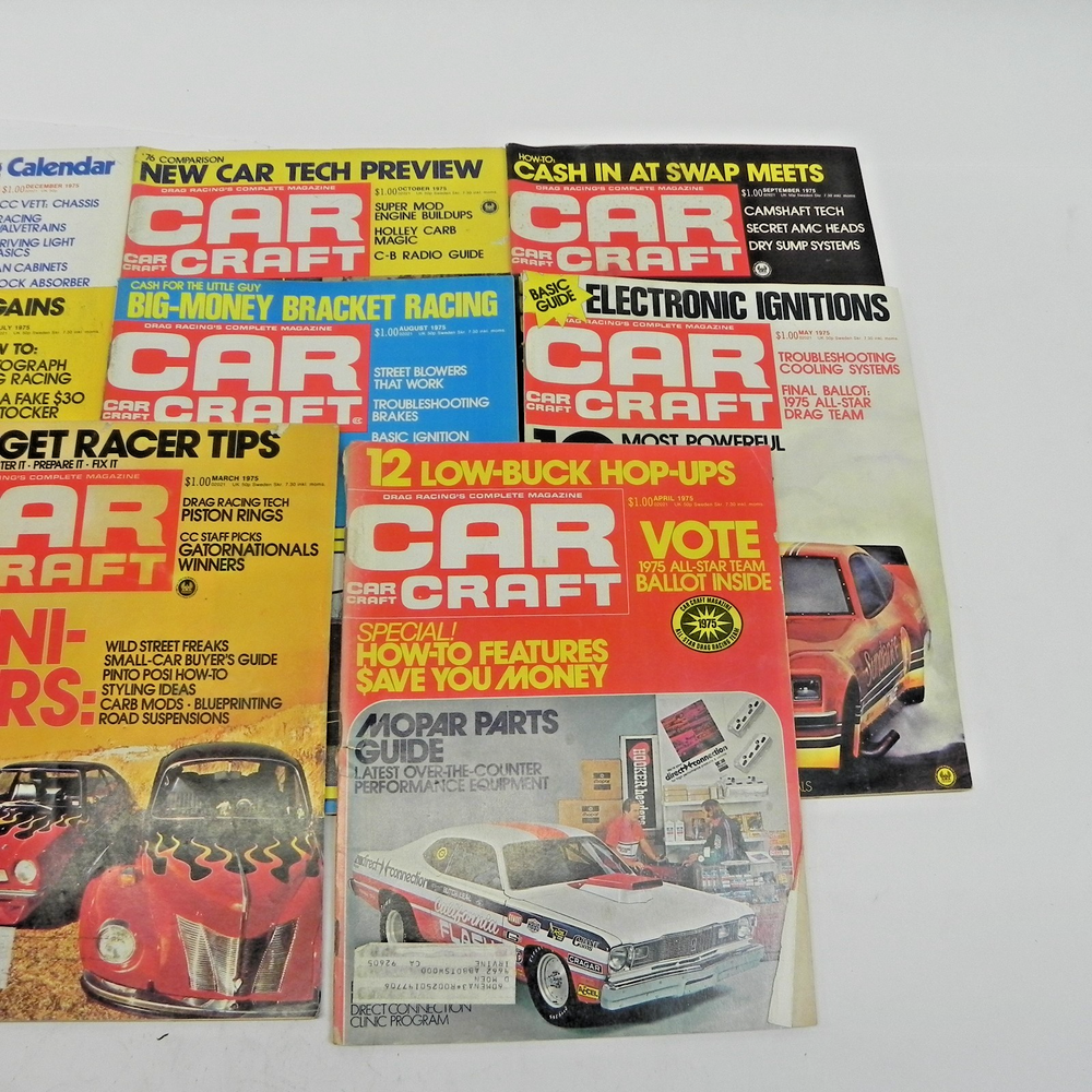 This lot of 8 Car Craft magazine issues from 1975 is a valuable collection for fans of hot rods, drag racing, and automotive performance. Featuring a mix of informative articles, expert advice, and captivating imagery, these magazines provide a comprehensive look at the car enthusiast culture of the era. With a focus on showcasing the latest trends and techniques in modifying and enhancing vehicles, this set is perfect for collectors and enthusiasts looking to expand their knowledge and appreciation for classic cars.