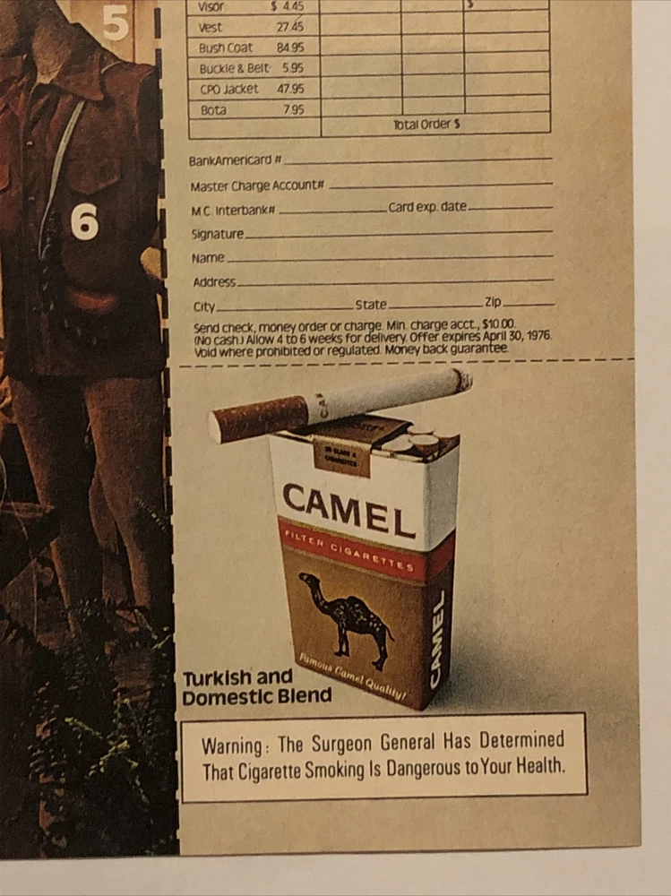 This vintage print ad from 1975 features a striking design showcasing Camel Filters cigarettes. The ad promotes a mail order offer for leather shop products and is perfect for collectors of advertising memorabilia. The ad was created in the United States during the 1970s and features the iconic Camel brand. The ad is a great addition to any collection, especially for those interested in vintage cigarette advertising. The colorful multi-color design is eye-catching and the ad would look great framed or displayed in any advertising collection. Don't miss out on this unique piece of Americana history. Original approximate 8”x11” vintage magazine print ad.