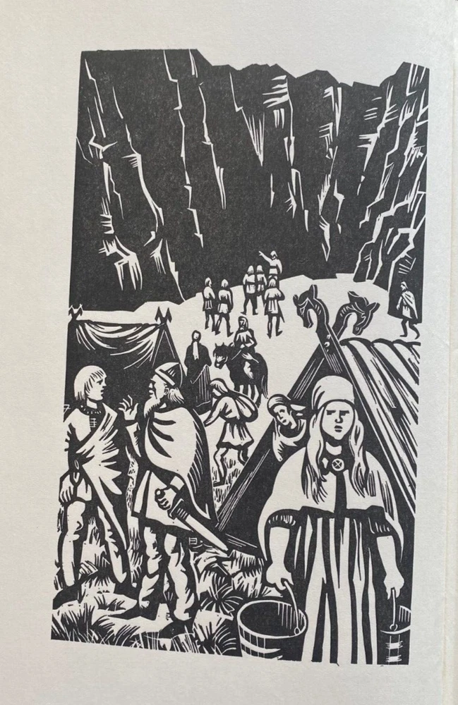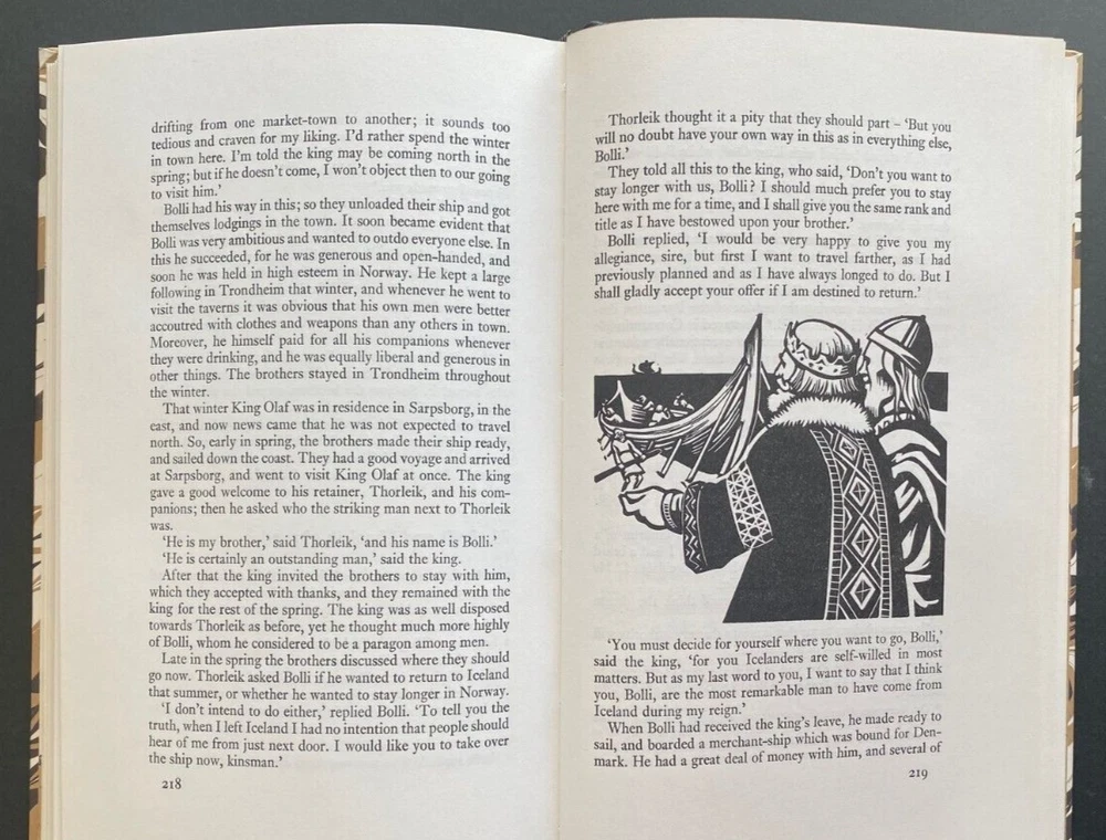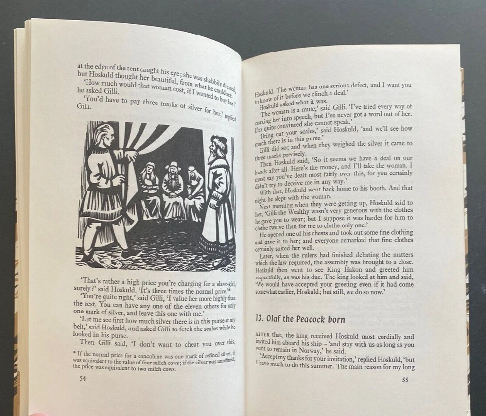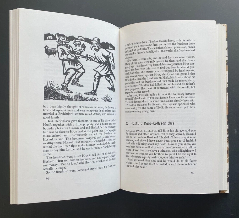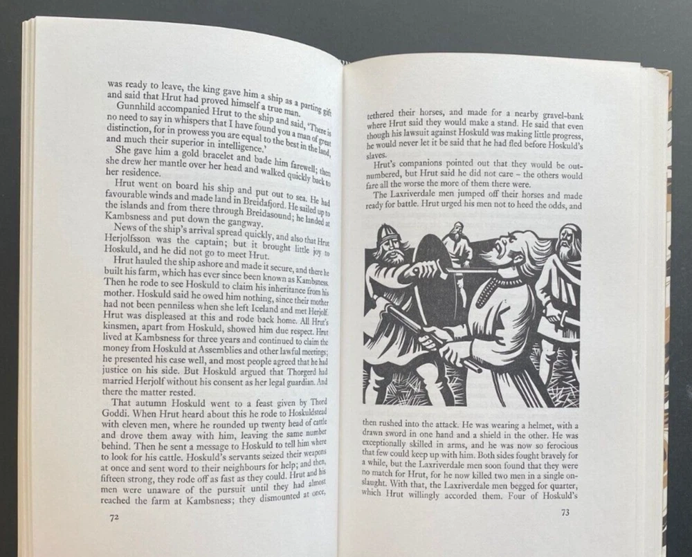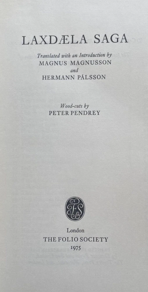 Express Shipping Worldwide is Free Laxdaela Saga Translation and introduction by Magnus Magnusson Published by The Folio Society, London, 1975 With several woodcuts by Peter Pendrey In Like New condition This volume is a notable English translation of one of the most famous Icelandic sagas from the medieval period. The saga itself, Laxdæla Saga, tells the story of the people of the Laxárdalur valley in Iceland, focusing on the complex relationships, feuds, and alliances between various families over several generations. The saga spans a wide range of events, including love, betrayal, rivalry, and vengeance. It is often considered one of the most compelling Icelandic sagas due to its intricate character development, dramatic events, and exploration of human emotions and social dynamics. At the heart of Laxdæla Saga is the story of Guðrún Ósvífursdóttir, a strong and determined woman whose life is marked by tragic love and difficult choices. The saga explores her relationships with three men—her first husband, the love of her life, and the one who ultimately brings her heartbreak—and her role in the ongoing conflicts between her family and others in the region. The tale is deeply rooted in Icelandic culture, exploring themes of honor, fate, and the roles of women in a patriarchal society. It provides insights into the early Icelandic settlers, their customs, and the brutal, yet poetic, nature of their society. Magnus Magnusson’s translation of the saga captures the language, tone, and cultural nuances of the original Old Norse text, making it accessible to modern readers. Magnusson, a renowned scholar and translator of Icelandic literature, is celebrated for his ability to preserve the narrative integrity and lyrical quality of the sagas while making them comprehensible to a broader audience. This volume is also beautifully designed and bound, with illustrations and maps that enhance the reader's experience of this historical and literary masterpiece. It is a significant work for those interested in Norse sagas, medieval Icelandic history, and the art of translation. In a fine decorated binding, in 255 pages. The Slipcase: There is light shelfwear. The Book: There is no shelfwear. There is no foxing. There are no previous owners' names or inscriptions. There are no missing, loose, creased, stained, or damaged pages. The spine and binding are solid. It is complete and original. Measures 14.5cm x 23.5cm. Express Shipping Worldwide is Free All items are securely and well packed. Thank you for viewing my item.