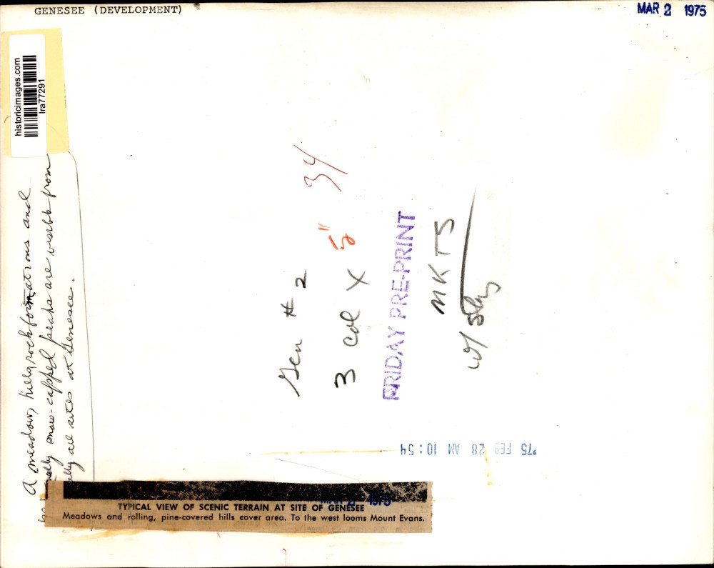 ebay template Note: Please study the images carefully to determine the condition of this vintage photograph, as it may not be in perfect condition. It may contain wrinkles, cracks, and possibly even tears due to its age and how it was handled before it got to us. A scanner may interpret colors and contrast differently than human eyes will, so it is possible that the actual photograph may be slightly darker or lighter in person. This vintage photograph is offered for sale as a collectible item and conveys no transfer of copyright. 1975 Press Photo Site of Genesee Community Develpment - lra77291 This is an original press photo. Typical View of Scenic Terrain at Site of Genesee--Meadows and rolling, pine-covered hills cover area. To the west looms Mount Evans; A meadow, hilly rock formations and ... snow-capped peaks are visible from ... all sites at Genesee.Photo measures 8.25 x 10.25inches. Photo is dated 02-28-1975. PHOTO FRONT PHOTO BACK Historic Images Part Number: lra77291 FAQs Q: Can I just download a digital version instead? A: No, we sell only vintage originals and do not make or distribute any copies, including digital ones. Q: Do you combine shipping and invoices? A: Multiple photos won on the same seller ID combine automatically through the eBay checkout process. If you encounter problems with this, send us a message via eBay messaging and we will send you an invoice. Due to eBay limitations, we cannot combine items won on our different seller IDs for a single shipping charge. Q: How quickly do you ship the items once paid? A: We ship within one business day after your payment clears. If you do not receive an "order shipped" email from us by the close of the second business day from submitting payment, please e-mail us via eBay messaging. Q: How do you make sure my photograph arrives safely? A: We package each order between two cross-corrugated pieces of cardboard to ensure that the package is as difficult to bend as possible. We then wrap each order in a plastic sheet to help protect against moisture. We want you to rest assured that we take every precaution to ensure that the photograph you receive will be in the same condition in your care as it was in ours. Q: Will the "Historic Images" watermark be on my photo when I receive it? A: No. This is a digital watermark we use to protect our images. It is not printed on the photo. Q: What are your office hours? A: eBay for us is a business, and a very fun one to be in! We are open M-F 9 to 5 (CST). Therefore, we do not return e-mails and phone calls over the weekend. We observe the following holidays: New Years Day, Memorial Day, Fourth of July, Labor Day, Thanksgiving and the day after Thanksgiving, Christmas Eve and Christmas Day. Q: Where did all these vintage photos come from? A: These original vintage photographs are from various news service and newspaper photo archives from locations around the country including: Boston, Detroit, Tampa, Chicago, Denver, Seattle, New Orleans, Milwaukee, Portland, Spokane, and more. We do not copy or reproduce any photographs -- every item is a unique vintage piece that was housed in a news archive. Q: Can I use this photograph in my book/blog/website? A: The short answer is no. There is no transfer of copyright for republication or reproduction with these photographs when you purchase them, and only photographs taken before 1923 are currently automatically in the public domain. Permission from the copyright holder, which usually can be identified from the back of each photo, must be sought to republish or reproduce the image for any purpose. Q: Do you relist items (in case I miss an auction ending)? A: Auction items that receive no bids are relisted in our store (historicimages-store on eBay) as a fixed-price item and at a higher price than the starting auction price. Q: Do you leave feedback? A: Yes, we always leave feedback for buyers. Our software monitors when our buyers leave us feedback, then notifies us that we can leave feedback for the buyer. Rest assured, if you leave feedback, we will do the same! Check out our family of eBay IDs: historicimages01 Sports Photos historicimages02 Entertainment Photos historicimages03 Americana Photos historicimages04 International & War Photos historicimages05 Transportation Photos historicimages06 Photos of All Subjects historicimages07 Entertainment Photos historicimages08 Newsworthy Photos historicimages09 Entertainment Photos historicimages10 Sports Photos historicimages-store Our largest fixed-price selection historicimages-gallery Hand-picked photos Saturday night auctions About Us Historic Images was formed in September 2009, with a handful of scanners working out of a basement to digitize newspaper photo archives. We have since moved out of the basement, and we can now archive thousands of photos per day. Our company has worked with magazines and newspapers from Detroit, Boston, Denver, Seattle, Tampa, Chicago, and New Orleans, just to name a few. We are constantly adding to our inventory, and have assembled an archive of millions of photos to date. As our company evolved, we began our eBay business, which brings thousands of fresh auctions per week to the world's largest online auction marketplace. Our custom software systems and team of great employees allow us to efficiently scan and sell large photo archives online. At the very core of our company's DNA is a strong commitment to customer satisfaction and strict integrity for our product. Our promise to you is that we will do everything in our power to provide you a great buying experience. Copyright 2009 - Present, Historic Images, Inc. Sell Smarter with Kyozou. Inventory and Ecommerce Management