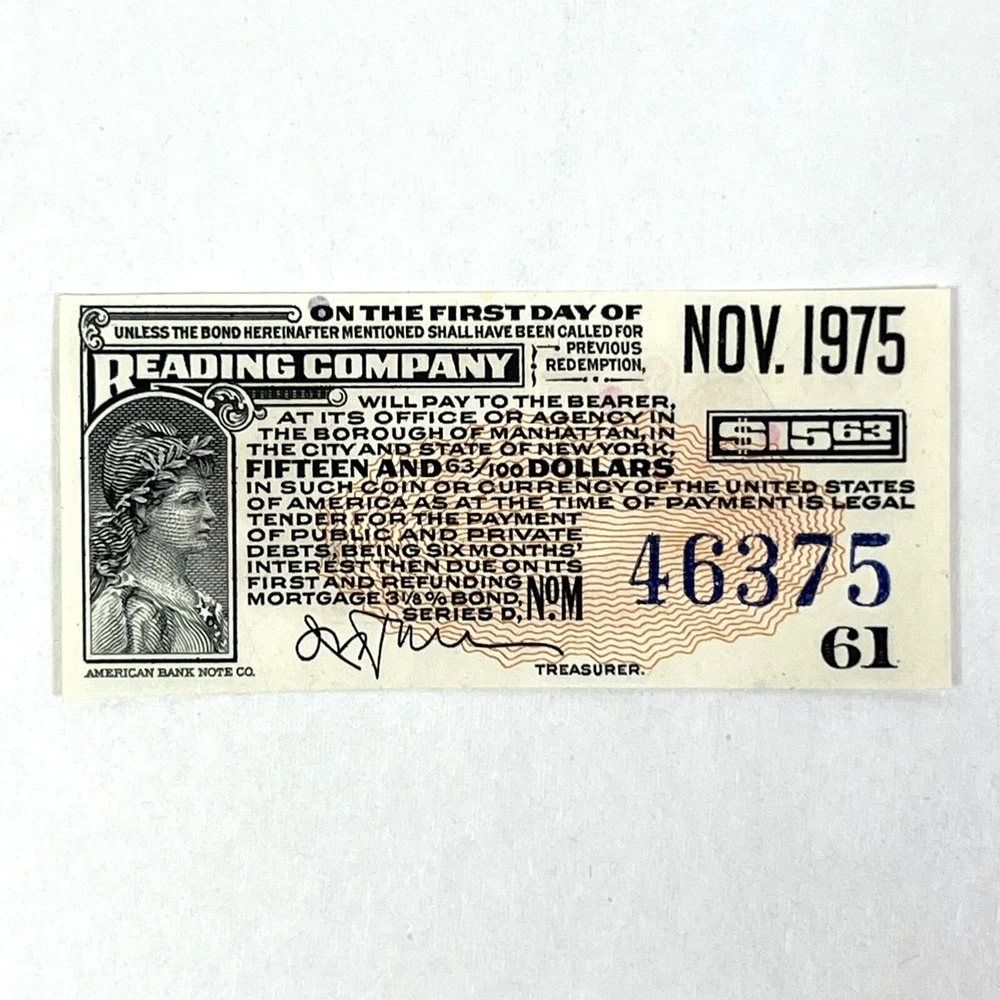 Vintage $15.63 bond coupon from Reading (railroad) Company. This particular coupon was redeemable on November 1975. Measures about 2 1/8" x 15/16". It features a printed signature and the serial number 46375. Coupon number is 61. This bond certificate is a great addition to any collection of obsolete currency, paper money or railroad memorabilia from Pennsylvania. It's ungraded and uncertified, in its raw and original condition. We strongly encourage you to thoroughly read the condition details above and to view all of the photos before purchasing, as these photos describe the item most accurately. If you have any questions or concerns, please do not hesitate to contact us and we will get back to you as soon as we can. All orders are packaged properly and promptly shipped from Las Vegas, NV, USA. Thank you for your interest; please take the time to view all of the items within our Curioddities eBay store, as we have a wide variety of items including antiques, books and magazines, collectibles, music, toys, and many other vintage rarities and obscurities. We will combine shipping costs, just ask!
