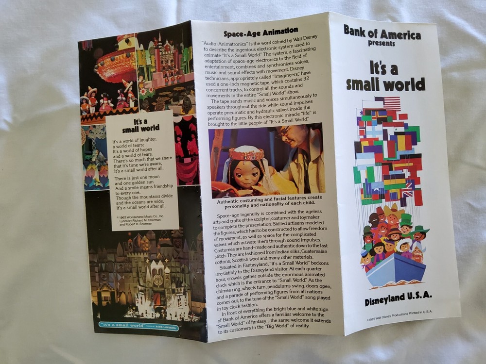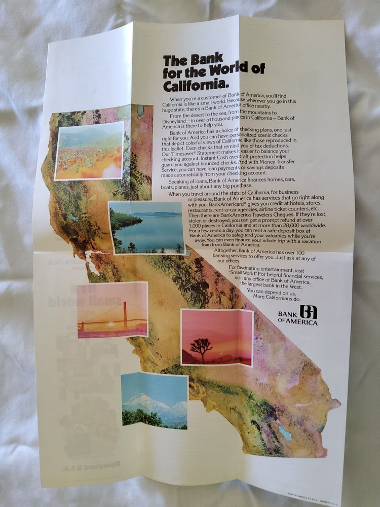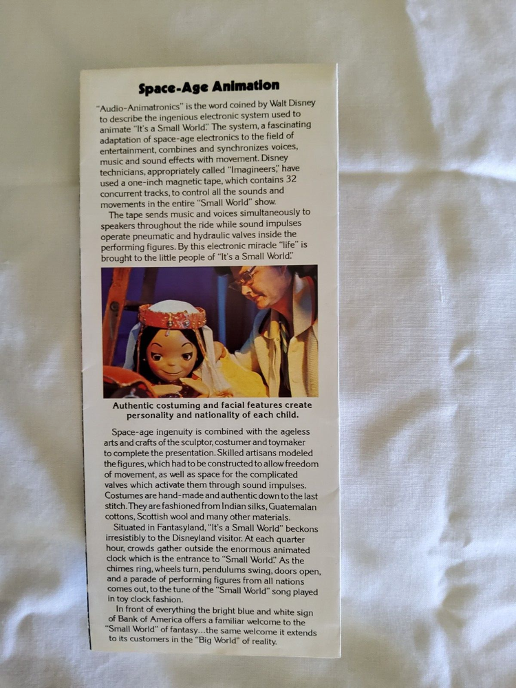Here is a 1975 Disneyland It's a Small World Bank of America folder for your very early Disney collection! It is in good condition with marks, edgewear, indentations and creases. Please look carefully at the pictures that are provided. Item is sold “as is”. I try to describe my items as accurately as possible. Please email me with any questions before bidding. NO INTERNATIONAL BIDDERS PLEASE Shipment will take place after receipt of cleared payment. I will package your item carefully for shipment. THANK YOU FOR LOOKING! PLEASE LOOK FOR MY OTHER DISNEYLAND ITEMS! I AM ALWAYS HAPPY TO COMBINE ITEMS FOR SHIPMENT TO SAVE YOU MONEY!