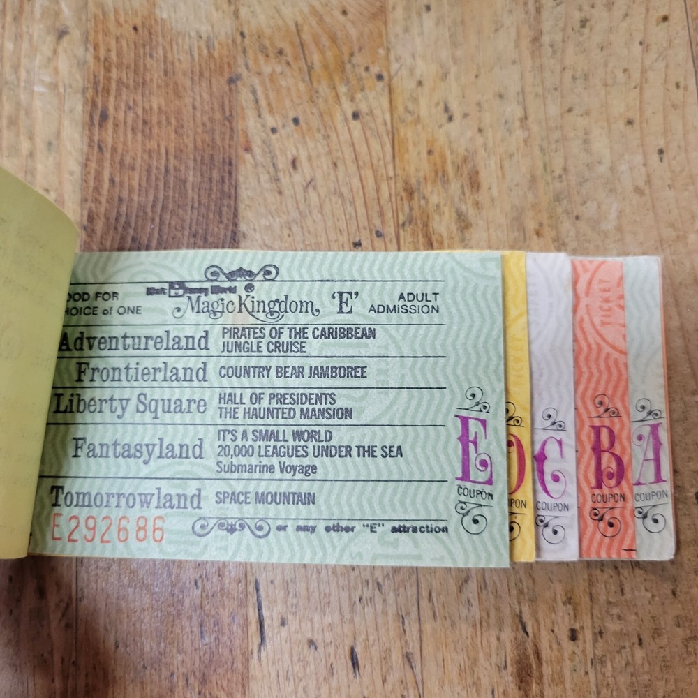 Here is a wonderful 1975 Disney World Junior ticket book for your Disney collection! It is a 10 Adventure ticket book with 5 tickets - 1 E, 1 D, 1 C, 1 B and 1 A ticket. The D, C and A tickets with the same serial number are attached to the ticket book. The E and B tickets with a different serial number are loose in the ticket book. The loose, added E ticket is an Adult ticket from the same era while the loose, added B ticket is a Junior ticket from the same era. The ticket book is in good condition with creases, folds, wrinkling, indentations, surface wear, edge wear, edge tears, scratches, scuffing, stains and some marks. It has lots of curving to the ticket book and does not lay flat. There is a line mark on the D ticket. Item is sold “as is”. I try to describe my items as accurately as possible. Please email me with any questions before bidding. NO INTERNATIONAL BIDDERS PLEASE Winning bidder to pay by PayPal within 3 days after the end of the auction. Buyer must have a confirmed PayPal shipping address. Shipment will take place after receipt of cleared payment. I will package your item carefully for shipment. THANK YOU FOR LOOKING! PLEASE LOOK FOR MY OTHER DISNEYLAND AUCTIONS! I AM ALWAYS HAPPY TO COMBINE ITEMS FOR SHIPMENT TO SAVE YOU MONEY