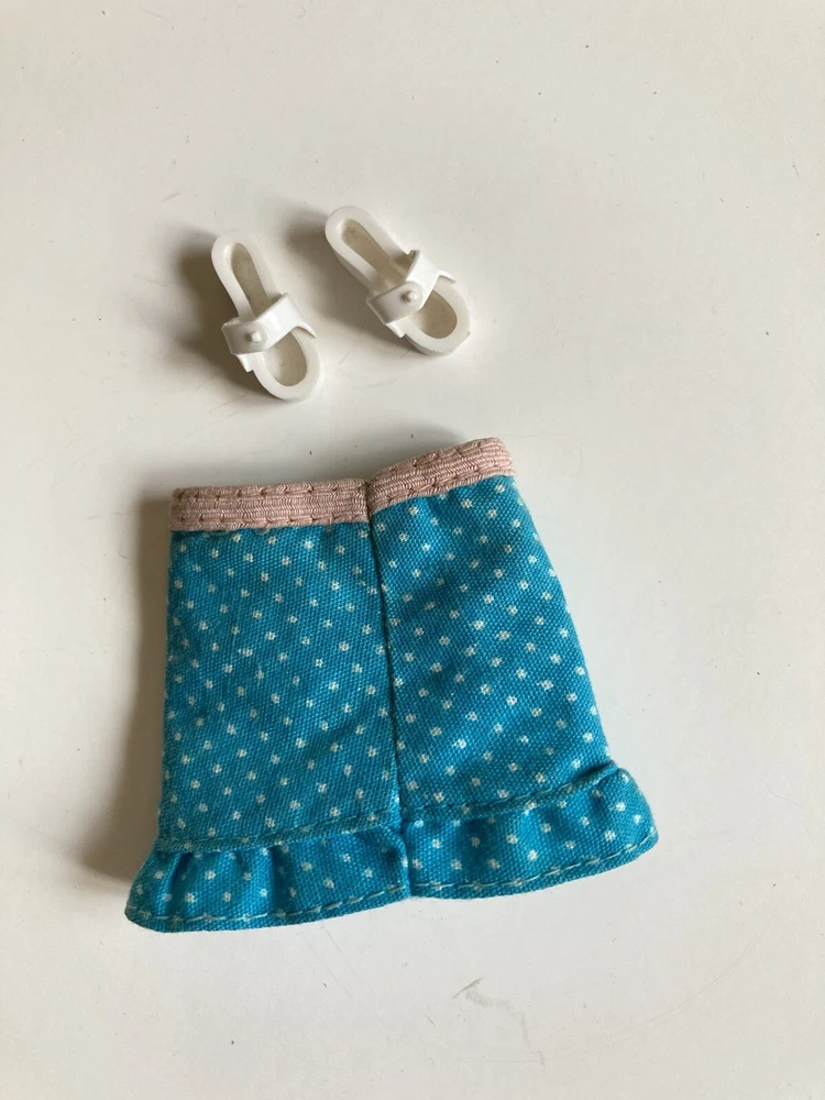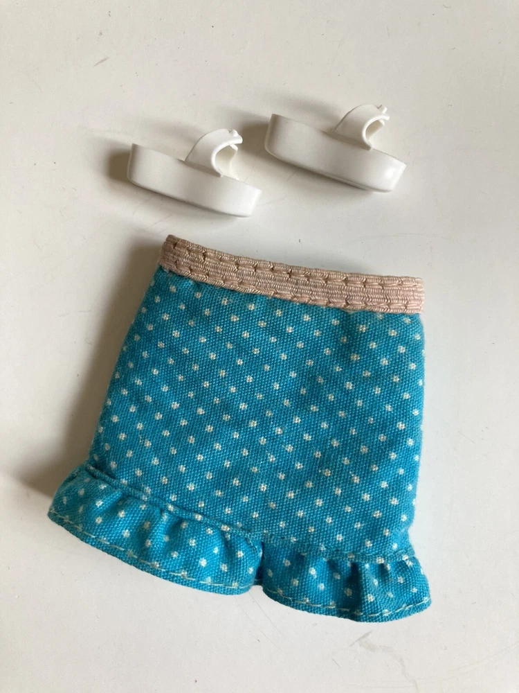 Skipper's friend Ginger blue dot mini skirt and white sandals.Skirt is in very good clean condition, elastic has lost stretch. Shoes are very good shape. Nice items to complete an outfit. Pstg. will be $4.25. Please ask any questions you may have. Smoke free home.