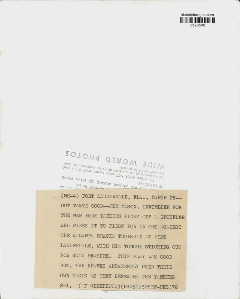 ebay template Note: Please study the images carefully to determine the condition of this vintage photograph, as it may not be in perfect condition. It may contain wrinkles, cracks, and possibly even tears due to its age and how it was handled before it got to us. A scanner may interpret colors and contrast differently than human eyes will, so it is possible that the actual photograph may be slightly darker or lighter in person. This vintage photograph is offered for sale as a collectible item and conveys no transfer of copyright. 1976 Press Photo Yankees infielder Jim Mason throws ball during game in Florida This is an original press photo. Fort Lauderdale, Florida - Jim Mason, infielder for the New York Yankees picks off a grounder and fires it to first for an out against the Atlanta Braves Thursday at Fort Lauderdale, with his tongue sticking out for good measure. This play was good but, the Braves apparently used their own magic as they defeated the Yankees 2-1.Photo measures 8.25 x 10inches. Photo is dated 3-25-1976. PHOTO FRONT PHOTO BACK Historic Images Part Number: kfa26598 FAQs Q: Can I just download a digital version instead? A: No, we sell only vintage originals and do not make or distribute any copies, including digital ones. Q: Do you combine shipping and invoices? A: Multiple photos won on the same seller ID combine automatically through the eBay checkout process. If you encounter problems with this, send us a message via eBay messaging and we will send you an invoice. Due to eBay limitations, we cannot combine items won on our different seller IDs for a single shipping charge. Q: How quickly do you ship the items once paid? A: We ship within one business day after your payment clears. If you do not receive an "order shipped" email from us by the close of the second business day from submitting payment, please e-mail us via eBay messaging. Q: How do you make sure my photograph arrives safely? A: We package each order between two cross-corrugated pieces of cardboard to ensure that the package is as difficult to bend as possible. We then wrap each order in a plastic sheet to help protect against moisture. We want you to rest assured that we take every precaution to ensure that the photograph you receive will be in the same condition in your care as it was in ours. Q: Will the "Historic Images" watermark be on my photo when I receive it? A: No. This is a digital watermark we use to protect our images. It is not printed on the photo. Q: What are your office hours? A: eBay for us is a business, and a very fun one to be in! We are open M-F 9 to 5 (CST). Therefore, we do not return e-mails and phone calls over the weekend. We observe the following holidays: New Years Day, Memorial Day, Fourth of July, Labor Day, Thanksgiving and the day after Thanksgiving, Christmas Eve and Christmas Day. Q: Where did all these vintage photos come from? A: These original vintage photographs are from various news service and newspaper photo archives from locations around the country including: Boston, Detroit, Tampa, Chicago, Denver, Seattle, New Orleans, Milwaukee, Portland, Spokane, and more. We do not copy or reproduce any photographs -- every item is a unique vintage piece that was housed in a news archive. Q: Can I use this photograph in my book/blog/website? A: The short answer is no. There is no transfer of copyright for republication or reproduction with these photographs when you purchase them, and only photographs taken before 1923 are currently automatically in the public domain. Permission from the copyright holder, which usually can be identified from the back of each photo, must be sought to republish or reproduce the image for any purpose. Q: Do you relist items (in case I miss an auction ending)? A: Auction items that receive no bids are relisted in our store (historicimages-store on eBay) as a fixed-price item and at a higher price than the starting auction price. Q: Do you leave feedback? A: Yes, we always leave feedback for buyers. Our software monitors when our buyers leave us feedback, then notifies us that we can leave feedback for the buyer. Rest assured, if you leave feedback, we will do the same! Check out our family of eBay IDs: historicimages01 Sports Photos historicimages02 Entertainment Photos historicimages03 Americana Photos historicimages04 International & War Photos historicimages05 Transportation Photos historicimages06 Photos of All Subjects historicimages07 Entertainment Photos historicimages08 Newsworthy Photos historicimages09 Entertainment Photos historicimages10 Sports Photos historicimages-store Our largest fixed-price selection historicimages-gallery Hand-picked photos Saturday night auctions About Us Historic Images was formed in September 2009, with a handful of scanners working out of a basement to digitize newspaper photo archives. We have since moved out of the basement, and we can now archive thousands of photos per day. Our company has worked with magazines and newspapers from Detroit, Boston, Denver, Seattle, Tampa, Chicago, and New Orleans, just to name a few. We are constantly adding to our inventory, and have assembled an archive of millions of photos to date. As our company evolved, we began our eBay business, which brings thousands of fresh auctions per week to the world's largest online auction marketplace. Our custom software systems and team of great employees allow us to efficiently scan and sell large photo archives online. At the very core of our company's DNA is a strong commitment to customer satisfaction and strict integrity for our product. Our promise to you is that we will do everything in our power to provide you a great buying experience. Copyright 2009 - Present, Historic Images, Inc. Sell Smarter with Kyozou. Inventory and Ecommerce Management