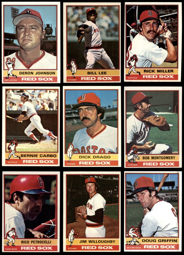 This set contains the following cards 1976 Topps #29 Rick Burleson 4 - VG/EX Front Back 1976 Topps #50 Fred Lynn 5 - EX Front Back 1976 Topps #78 Cecil Cooper 5 - EX Front Back 1976 Topps #102 Jim Willoughby 4 - VG/EX Front Back 1976 Topps #118 - Darrell Johnson Red Sox Team Checklist 4 - VG/EX Front Back 1976 Topps #130 Luis Tiant 4 - VG/EX Front Back 1976 Topps #142 Dick Drago 5 - EX Front Back 1976 Topps #170 Rick Wise 5 - EX Front Back 1976 Topps #192 - Rod Carew / Fred Lynn / Thurman Munson AL Batting Leaders 4 - VG/EX Front Back 1976 Topps #196 - George Scott / John Mayberry / Fred Lynn AL RBI Leaders 5 - EX Front Back 1976 Topps #230 Carl Yastrzemski 5 - EX Front Back 1976 Topps Traded #231 T Tom House 4 - VG/EX Front Back 1976 Topps Traded #250 T Fergie Jenkins 4 - VG/EX Front Back 1976 Topps #278 Bernie Carbo 5 - EX Front Back 1976 Topps #302 Rick Miller 4 - VG/EX Front Back 1976 Topps #326 Dick Pole 4 - VG/EX Front Back 1976 Topps #340 Jim Rice 4 - VG/EX Front Back 1976 Topps #365 Carlton Fisk 5 - EX Front Back 1976 Topps #381 Denny Doyle 3 - VG Front Back 1976 Topps #396 Bill Lee 5 - EX Front Back 1976 Topps #419 Reggie Cleveland 2 - GOOD Front Back 1976 Topps #445 Rico Petrocelli 4 - VG/EX Front Back 1976 Topps #461 Luis Tiant NL & AL Championships 4 - VG/EX Front Back 1976 Topps #471 Jim Burton 4 - VG/EX Front Back 1976 Topps #523 Bob Montgomery 4 - VG/EX Front Back 1976 Topps #529 Deron Johnson 5 - EX Front Back 1976 Topps #575 Dwight Evans 5 - EX Front Back 1976 Topps #632 Rogelio Moret 4 - VG/EX Front Back 1976 Topps #654 Doug Griffin 5 - EX Front Back This 1976 Topps Boston Red Sox Team Set Team Set contains Red Sox baseball cards and makes a great gift for any fan. ?With an inventory of over 15,000 team sets, Dean's Cards has Team Sets & Near Team Sets for just about every team, in multiple conditions, for all sports, for most major sets issued between 1909 and 1979. There is also a 1976 Team Set available from SSPC. Set breakdown by grade: Number of Cards in Set 29 Average Grade - Weighted by Value 4.54 - VG/EX+ Average Grade - Unweighted 4.31 - VG/EX+ Grade Breakdown 5 - EX 12 4 - VG/EX 15 3 - VG 1 2 - GOOD 1 "The following cards are omitted, in order to keep the cost of the set reasonable: "#347 All-Time All-Stars - Ted Williams, #462 1975 World Series - Reds Champs, #594 Rookie Catchers and Outfielders - Andy Merchant / Ed Ott / Royle Stillman / Jerry White and #597 Rookie Pitchers - Don Aase / Jack Kucek / Frank LaCorte / Mike Pazik Dean's Cards offers a 100% Money Back Satisfaction Guarantee on all purchases. Just contact us within 10 days of the purchase date and we will refund your money or, when possible, replace the cards. 1976 Topps Boston Red Sox Team Set 4.5 - VG/EX+ 6908782 If the scan in the listing says ACTUAL IMAGE, you will receive the card pictured. For cards issued after 1983, we will often use representative images and you will not receive the exact card pictured. Shipping Policy You only pay shipping on the first item. If you order multiple items on the same order, you will only be charged once for shipping. We do not combine shipping on multiple orders. To avoid multiple shipping charges we recommend using eBay's "Add to Cart" feature to check out multiple items in one transaction, or please request and allow for us to send an invoice to reflect the combined shipping charges. Canadian customers - We send all of our Canadian/International packages with tracking and cannot make any exceptions to this policy. Negotiating Prices All prices are final and we do not negotiate. This policy is to ensure that everyone knows that they are getting our best possible price. So please do not ask us to negotiate on price. Return Policy Dean's Cards has a 100% Money Back Satisfaction Guarantee on all purchases, as long as the product is returned within 30 days of receiving the product. Card Grading Each card is first reviewed by a member of our team, in order to detect any flaws that may not be visible on a scan, such as wrinkles, creases, print spots, or light stains. The vast majority of our vintage cards are professionally graded by the Dean's Cards Grading Software and include a 100% satisfaction guarantee. Our grading is on par with PSA standards when it comes to corners, centering and flaws - and tends to grade a bit tougher than PSA, on cards with a tilted image or rough edges. This grading software was developed to provide far better grading and consistency than can be achieved using the human eye. Determining the card's grade The sharpness of the corners and the degree to which a card was cut off-center determines the maximum possible grade that the card can receive. The card's grade is further reduced by any flaws or blemishes that it may have. Each card is evaluated on the following characteristics and assigned a score. Corners - Each corner of a card is individually analyzed, and then assigned a score on how square, sharp, and flawless it appears. Centering - The borders are measured, at multiple points along the edge, to determine the horizontal and vertical centering and tilt. Defects - The card is examined for imperfections, such as: size, print flaws, dings, stains, creases, or other wear which could lower its grade. Bonus for Perfect Centering - A vintage card, with near perfect centering, is given a one-half grade bonus. So when you buy one of our cards with a half-grade (e.g. 3.5 or 6.5) it will appear perfectly centered, both vertically and horizontally. Grading Criteria Worst Corner - A card can grade only as high as the worst corner will allow. Average Corner Tilt - The difference in width of a card border near the top, compared to the bottom. OCT - The sum of how far a card is Off-Center, plus its Tilt. Minimum Centering Requirements Eye Appeal - The combination of a card's centering, corners and tilt. Well-Centered - Cards that appear perfectly centered receive a bonus of one-half grade. Flaws, defects and other imperfections - can lower a 