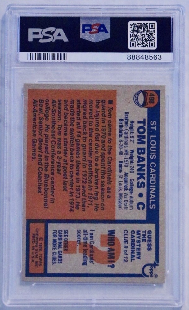 Manufacturer:ToppsLeague:National Football League (NFL)Player/Athlete:Tom BanksTeam:St. Louis CardinalsSet:1976 Toppsbrand:ToppsFeatures:Rookie, Base SetSeason:1976Sport:FootballParallel/Variety:[Base]Card Number:498Series:Topps
