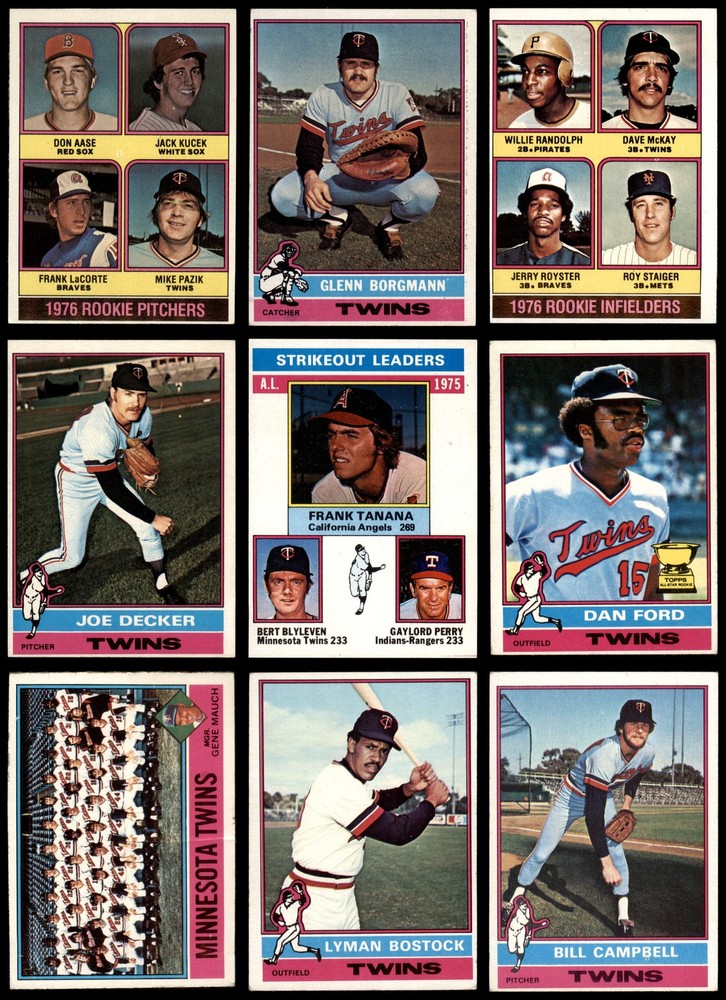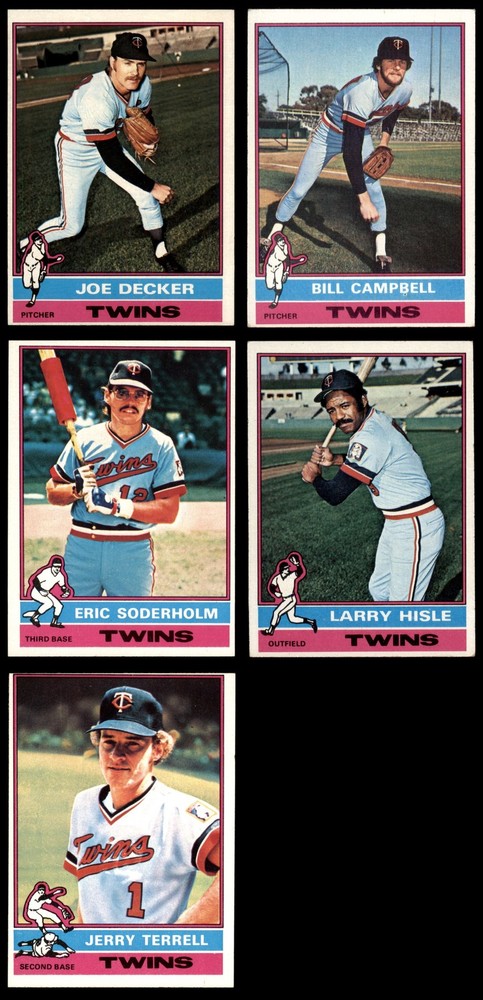 This set contains the following cards 1976 Topps #11 Jim Hughes 2 - GOOD Front Back 1976 Topps #35 Tony Oliva 4 - VG/EX Front Back 1976 Topps #59 Larry Hisle 2 - GOOD Front Back 1976 Topps #87 Tom Burgmeier 4 - VG/EX Front Back 1976 Topps #111 Danny Thompson 4 - VG/EX Front Back 1976 Topps #136 Dave Goltz 4 - VG/EX Front Back 1976 Topps #159 Jerry Terrell 4 - VG/EX Front Back 1976 Topps #183 Steve Braun 4 - VG/EX Front Back 1976 Topps #192 - Rod Carew / Fred Lynn / Thurman Munson AL Batting Leaders 3 - VG Front Back 1976 Topps #204 - Frank Tanana / Bert Blyleven / Gaylord Perry AL Strikeout Leaders 4 - VG/EX Front Back 1976 Topps #214 Eric Soderholm 4 - VG/EX Front Back 1976 Topps #235 Bert Blyleven 4 - VG/EX Front Back 1976 Topps #263 Lyman Bostock 3 - VG Front Back 1976 Topps #288 Bill Campbell 3 - VG Front Back 1976 Topps #313 Dan Ford 3 - VG Front Back 1976 Topps #336 Vic Albury 4 - VG/EX Front Back 1976 Topps #373 Johnny Briggs 4 - VG/EX Front Back 1976 Topps #400 Rod Carew 3 - VG Front Back 1976 Topps #424 Phil Roof 3 - VG Front Back 1976 Topps #448 Tom Johnson 4 - VG/EX Front Back 1976 Topps #474 Ray Corbin 4 - VG/EX Front Back 1976 Topps #498 Glenn Borgmann 3 - VG Front Back 1976 Topps #519 Steve Brye 4 - VG/EX Front Back 1976 Topps #556 - Gene Mauch Twins Team Checklist 1.5 - FAIR Front Back 1976 Topps #592 - Willlie Randolph / Jerry Royster / Dave McKay / Roy Staiger Rookie Infielders 3 - VG Front Back 1976 Topps #597 - Don Aase / Jack Kucek / Frank LaCorte / Mike Pazik Rookie Pitchers 4 - VG/EX Front Back 1976 Topps #619 Bill Butler 3 - VG Front Back 1976 Topps #636 Joe Decker 4 - VG/EX Front Back This 1976 Topps Minnesota Twins Team Set Team Set contains Twins baseball cards and makes a great gift for any fan. ?With an inventory of over 15,000 team sets, Dean's Cards has Team Sets & Near Team Sets for just about every team, in multiple conditions, for all sports, for most major sets issued between 1909 and 1979. There is also a 1976 Team Set available from SSPC. Set breakdown by grade: Number of Cards in Set 28 Average Grade - Weighted by Value 3.37 - VG+ Average Grade - Unweighted 3.45 - VG+ Grade Breakdown 4 - VG/EX 16 3 - VG 9 2 - GOOD 2 1.5 - FAIR 1 The following card is omitted, in order to keep the cost of the set reasonable. It can be purchased separately: Dean's Cards offers a 100% Money Back Satisfaction Guarantee on all purchases. Just contact us within 10 days of the purchase date and we will refund your money or, when possible, replace the cards. 1976 Topps Minnesota Twins Team Set 3.5 - VG+ 6908788 If the scan in the listing says ACTUAL IMAGE, you will receive the card pictured. For cards issued after 1983, we will often use representative images and you will not receive the exact card pictured. Shipping Policy You only pay shipping on the first item. If you order multiple items on the same order, you will only be charged once for shipping. We do not combine shipping on multiple orders. To avoid multiple shipping charges we recommend using eBay's "Add to Cart" feature to check out multiple items in one transaction, or please request and allow for us to send an invoice to reflect the combined shipping charges. Canadian customers - We send all of our Canadian/International packages with tracking and cannot make any exceptions to this policy. Negotiating Prices All prices are final and we do not negotiate. This policy is to ensure that everyone knows that they are getting our best possible price. So please do not ask us to negotiate on price. Return Policy Dean's Cards has a 100% Money Back Satisfaction Guarantee on all purchases, as long as the product is returned within 30 days of receiving the product. Card Grading Each card is first reviewed by a member of our team, in order to detect any flaws that may not be visible on a scan, such as wrinkles, creases, print spots, or light stains. The vast majority of our vintage cards are professionally graded by the Dean's Cards Grading Software and include a 100% satisfaction guarantee. Our grading is on par with PSA standards when it comes to corners, centering and flaws - and tends to grade a bit tougher than PSA, on cards with a tilted image or rough edges. This grading software was developed to provide far better grading and consistency than can be achieved using the human eye. Determining the card's grade The sharpness of the corners and the degree to which a card was cut off-center determines the maximum possible grade that the card can receive. The card's grade is further reduced by any flaws or blemishes that it may have. Each card is evaluated on the following characteristics and assigned a score. Corners - Each corner of a card is individually analyzed, and then assigned a score on how square, sharp, and flawless it appears. Centering - The borders are measured, at multiple points along the edge, to determine the horizontal and vertical centering and tilt. Defects - The card is examined for imperfections, such as: size, print flaws, dings, stains, creases, or other wear which could lower its grade. Bonus for Perfect Centering - A vintage card, with near perfect centering, is given a one-half grade bonus. So when you buy one of our cards with a half-grade (e.g. 3.5 or 6.5) it will appear perfectly centered, both vertically and horizontally. Grading Criteria Worst Corner - A card can grade only as high as the worst corner will allow. Average Corner Tilt - The difference in width of a card border near the top, compared to the bottom. OCT - The sum of how far a card is Off-Center, plus its Tilt. Minimum Centering Requirements Eye Appeal - The combination of a card's centering, corners and tilt. Well-Centered - Cards that appear perfectly centered receive a bonus of one-half grade. Flaws, defects and other imperfections - can lower a card's grade. Card Backs - the above criteria is also considered, for the back of the cards, but does not inflict as severe of a penalty to its grade. Packaging Once scanned, the cards a
