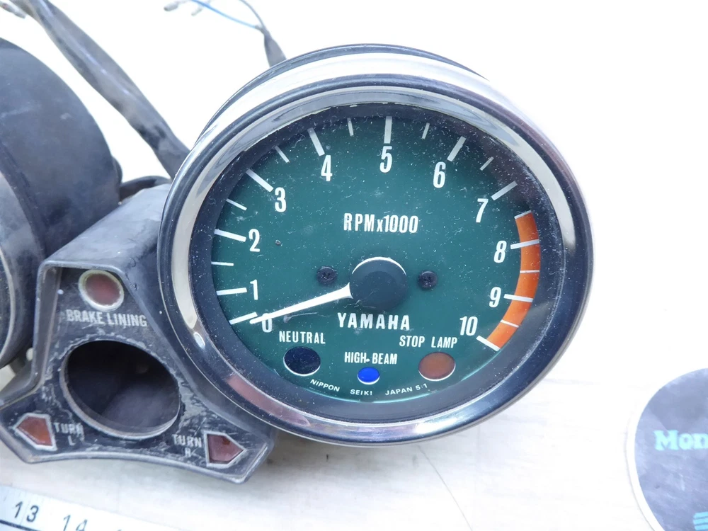 FOR SALE: gauge cluster ORIGIN: 1976 Yamaha XS650 with 15,367 miles. May fit other years and models, contact your local dealer to confirm fitment. CONDITION/DESCRIPTION: the gauges were tested and the speedo gauge is in working condition but the tach gauge moves slow making the assembly for parts or repair, the reset knob spins well and moves the odometer, we are unable to test the light panel so the working condition is unknown, the dial faces have some light fading but are still clean and readable, the glass has no cracks or holes, the cable fitting threads are not stripped but may have some light stress from use, the mounts look good, the wire ends and connectors are in good shape, the panel appears to have no bends or warping, the backs have no dents but some small dings may be present, the assembly has some scratches light rust and wear from use, please see the pictures for additional details. MRC INVENTORY NUMBER: Y393-1 OUR PROMISE 1. Our parts are QUALITY USED PARTS and we are a LICENSED motorcycle salvage dealer by the state of Wisconsin. 2. Any major flaws in any parts are DISCLOSED to YOU, to the best of our ability. 3. We try our best to give YOU a smooth and easy transaction. 4. We ship PROMPTLY - so YOU don't have to wait - normal delivery occurs 1 to 7 business days to anywhere the continental US. SHIPPING • Shipment will be processed 1 business day after payment is received. • International- please contact us for a quote • We will combine shipping • Please ensure your address is correct in PayPal before purchasing your item RETURNS If not satisfied, we will accept a return and offer a 100% refund FEEDBACK Please contact us to resolve a problem before leaving negative feedback. All issues can be worked out. SEARCH STORE Parts being sold are taken from used motorcycles that were not totaled or subjected to water damage. Please check our store for any other items you may want, all of our items for sale are listed on eBay. eBay STORE CONTACT Powered by SixBit's eCommerce Solution