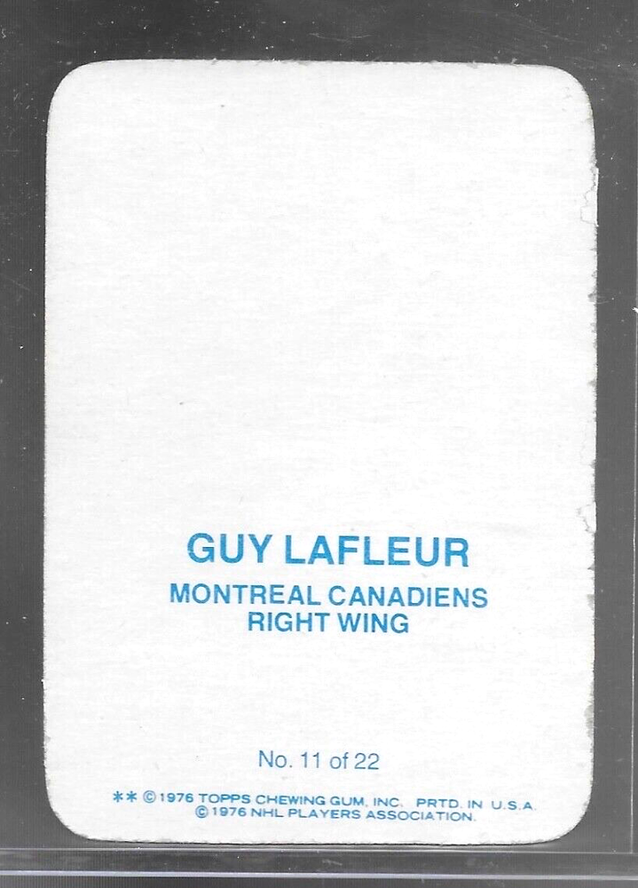 Parallel/Variety: Glossy Card Number: 11 Type: Sports Trading Card Year Manufactured: 1976 Season: 1976-77 Set: 1976-77 Topps Team: Montreal Canadiens Card Condition: Excellent Original/Licensed Reprint: Original Country/Region of Manufacture: United States Sport: Ice Hockey Vintage: Yes Player/Athlete: Guy Lafleur Features: Base Set, Insert League: National Hockey League (NHL) Manufacturer: Topps