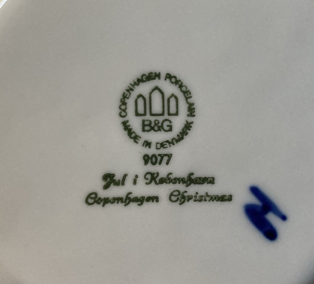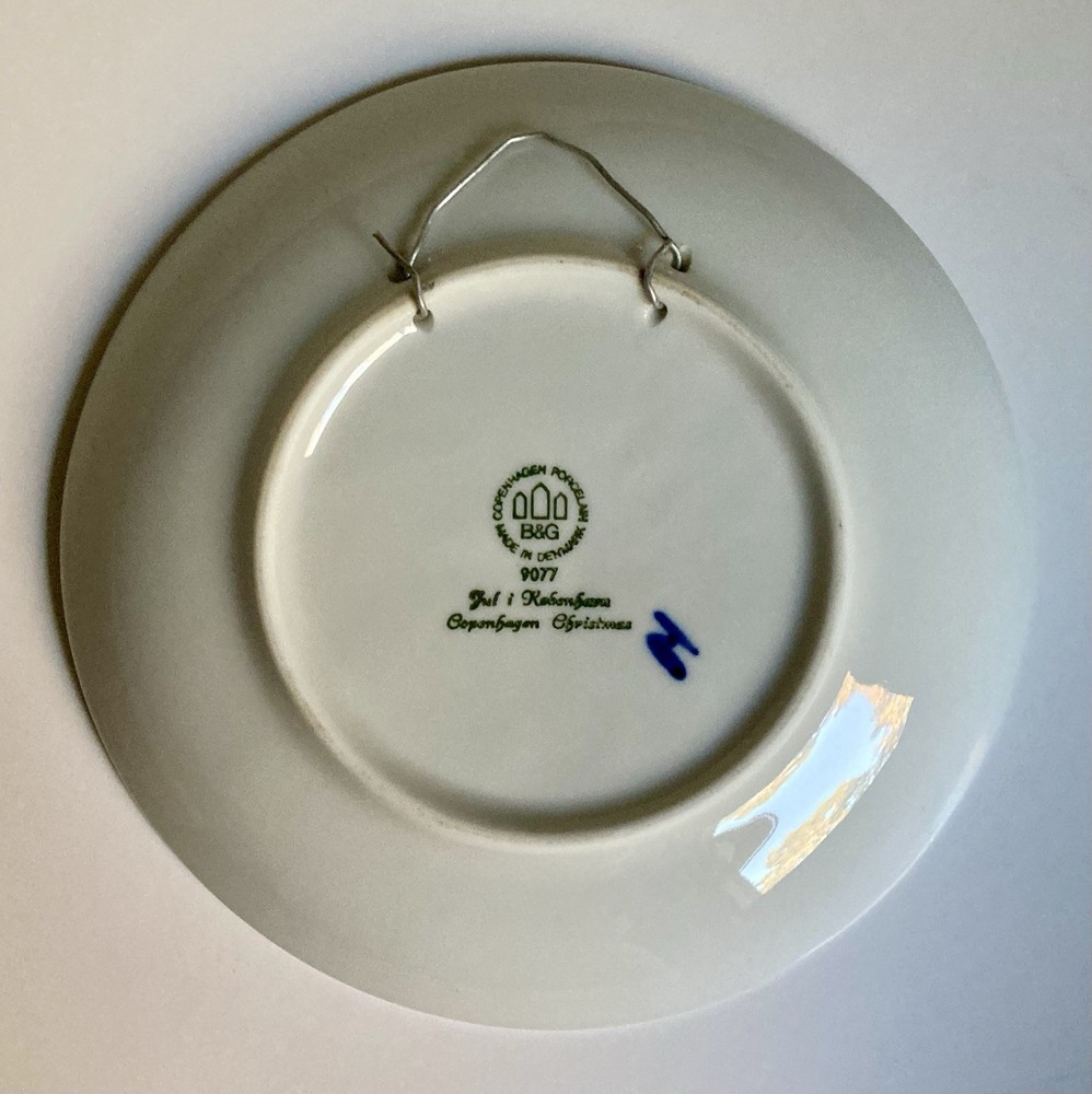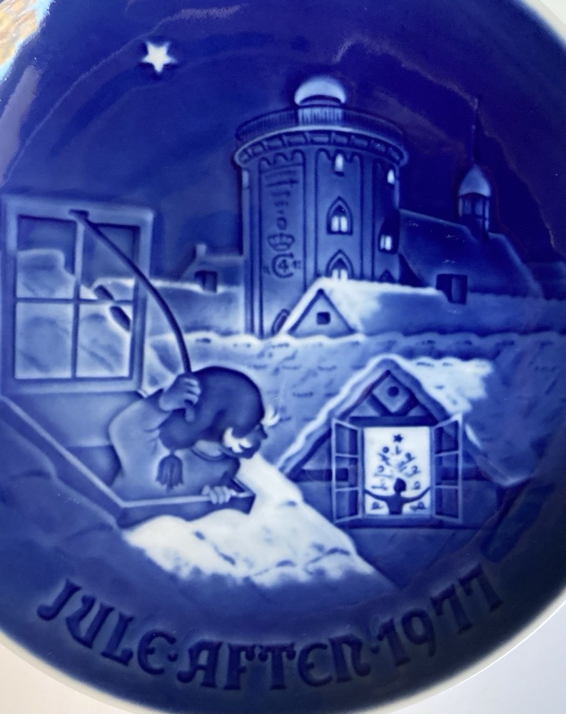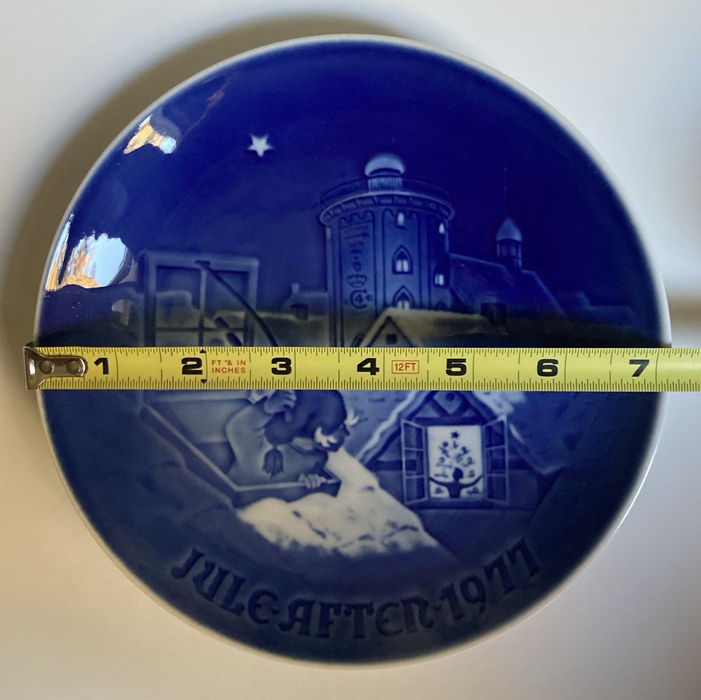 1977 B&G Copenhagen Blue Annual Christmas Porcelain Plate by Bing & Grondahl. Measures approximately 7.25 inches in diameter. Each of these annual plates depicts a unique Christmas scene. The 1977 image appears to depict Santa exiting one rooftop only to be discovered by someone peering out their window in a neighboring home. No cracks or chips. Metal wire attached for ease of display, but it can easily be removed if you desire. Message with questions.