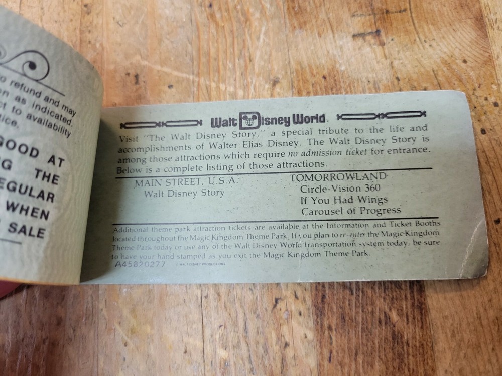 Here is a wonderful 1977 Disney World Junior ticket book for your Disney collection! It is a 12 Adventure ticket book with 5 tickets - 1 E, 1 D, 1 C, 1 B and 1 A ticket. The E, D, B and A tickets with the same serial number are attached to the ticket book. The C ticket with a different serial number is loose in the ticket book. The loose, added C ticket is an Adult ticket from the same era. The ticket book is in good condition with creases, folds, wrinkling, indentations, surface wear, edge wear, edge tears, scratches, scuffing, stains and some marks. Item is sold “as is”. I try to describe my items as accurately as possible. Please email me with any questions before bidding. NO INTERNATIONAL BIDDERS PLEASE Winning bidder to pay by PayPal within 3 days after the end of the auction. Buyer must have a confirmed PayPal shipping address. Shipment will take place after receipt of cleared payment. I will package your item carefully for shipment. THANK YOU FOR LOOKING! PLEASE LOOK FOR MY OTHER DISNEYLAND AUCTIONS! I AM ALWAYS HAPPY TO COMBINE ITEMS FOR SHIPMENT TO SAVE YOU MONEY