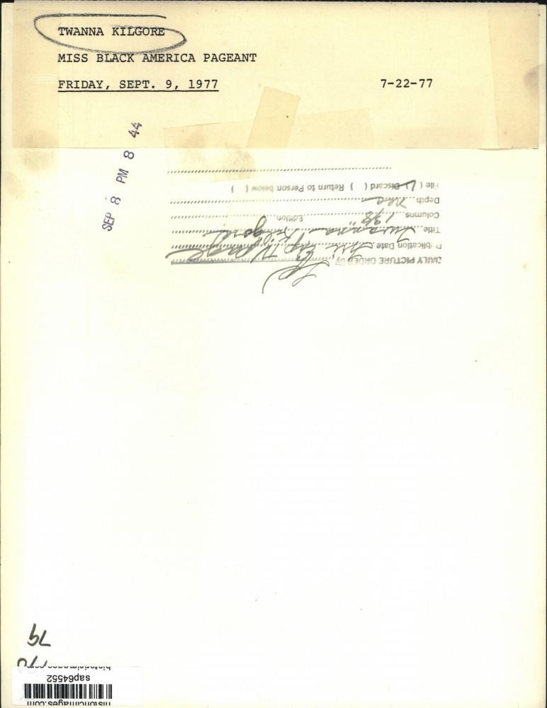 ebay template Note: Please study the images carefully to determine the condition of this vintage photograph, as it may not be in perfect condition. It may contain wrinkles, cracks, and possibly even tears due to its age and how it was handled before it got to us. A scanner may interpret colors and contrast differently than human eyes will, so it is possible that the actual photograph may be slightly darker or lighter in person. This vintage photograph is offered for sale as a collectible item and conveys no transfer of copyright. 1977 Press Photo Twanna Kilgore, Miss Black America Pageant - sap64552 This is an original press photo. Twanna Kilgore, Miss Black America PageantPhoto measures 7.25 x 9.5inches. Photo is dated 07-22-1977. PHOTO FRONT PHOTO BACK Historic Images Part Number: sap64552 Sell Smarter with Kyozou. Inventory and Ecommerce Management