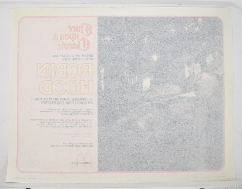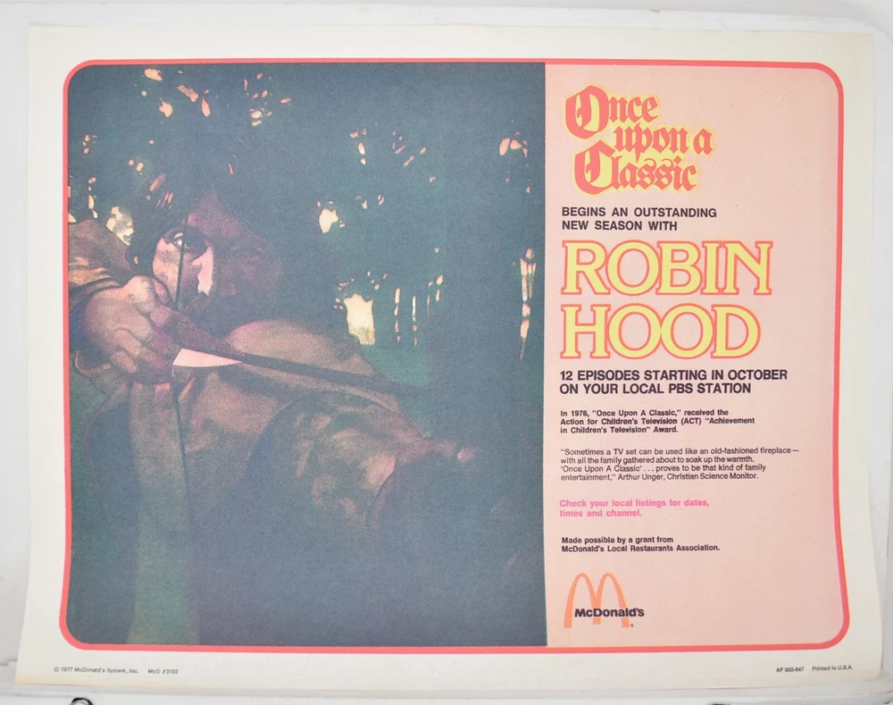 Original Vintage 1977 Ronald McDonalds Robin Hood TV Series PBS Station Once Upon A Classic Advertising Restaurant Placemat It measures 13" x 10" Check out my other Antiques and Collectibles. I give discounts on multiple purchases and combine shipping. Stored in T-16