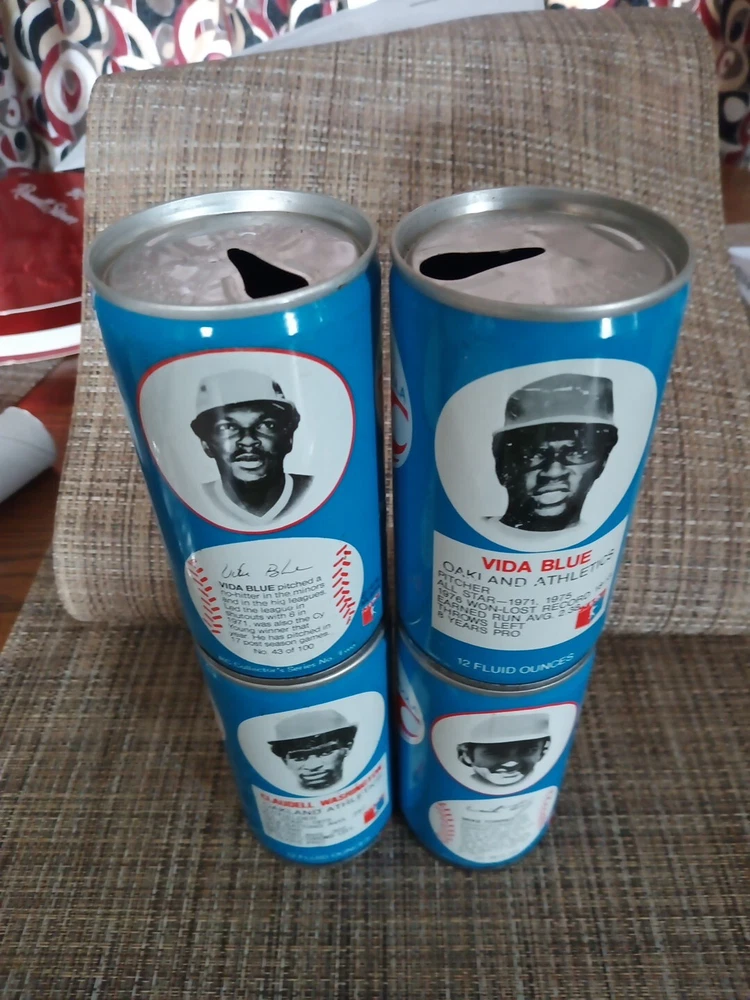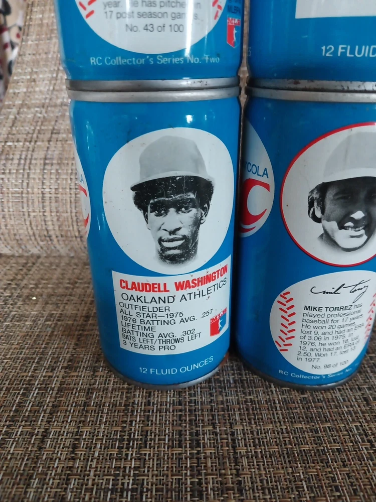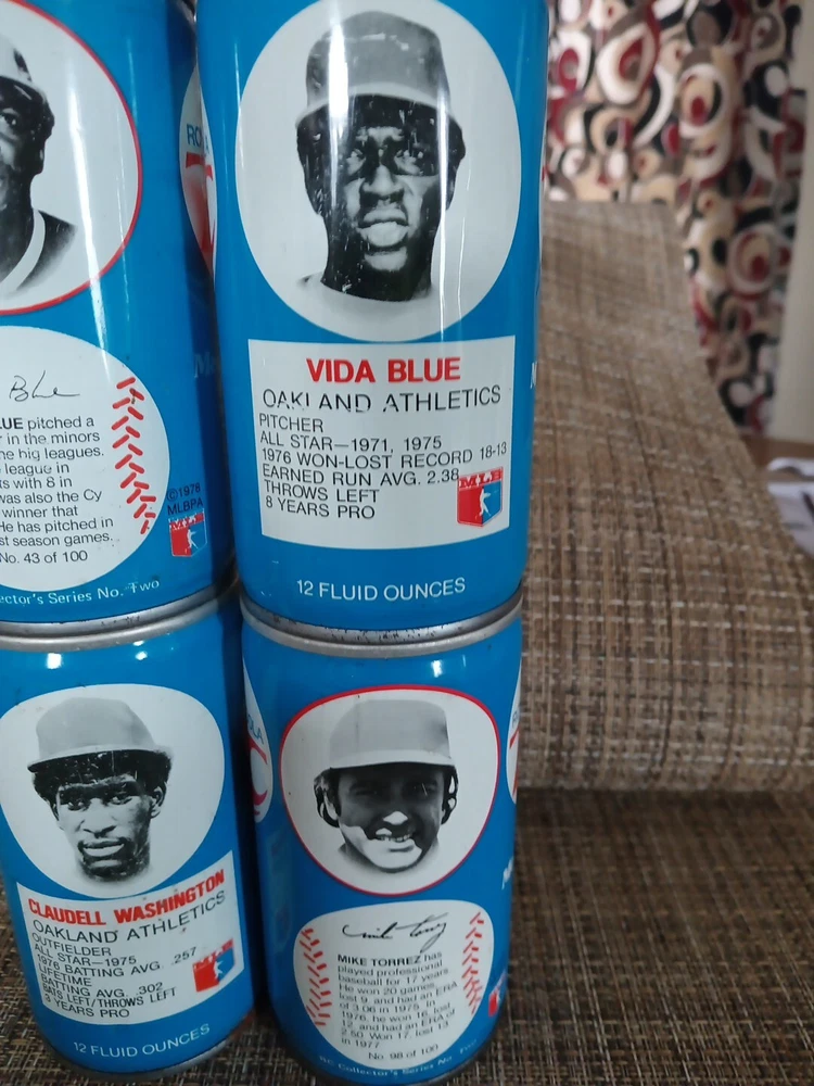 2 Vida Blue cans both have some surface rust in spots and few scratches. Claudell Washington can has surface rust on bottom of can and few scratches. Mike Torres can has a few spots of surface rust.nice can. These cans are not perfect. Been boxed up for years. Selling from my personal collection