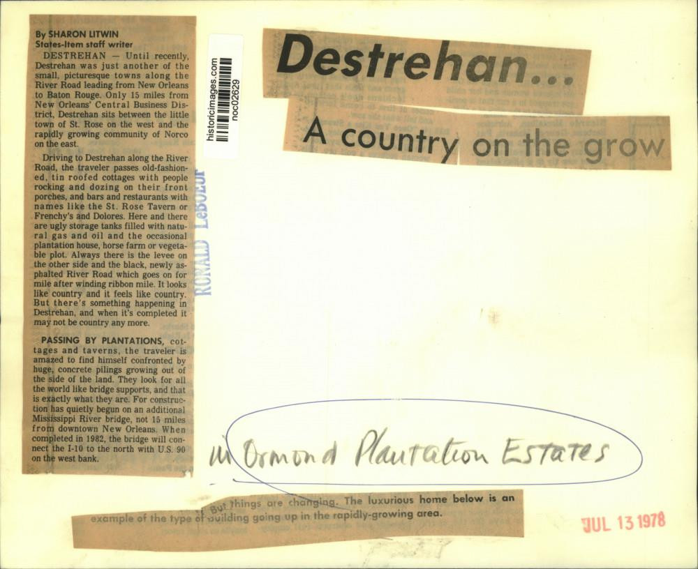 ebay template Note: Please study the images carefully to determine the condition of this vintage photograph, as it may not be in perfect condition. It may contain wrinkles, cracks, and possibly even tears due to its age and how it was handled before it got to us. A scanner may interpret colors and contrast differently than human eyes will, so it is possible that the actual photograph may be slightly darker or lighter in person. This vintage photograph is offered for sale as a collectible item and conveys no transfer of copyright. 1978 Press Photo Home in Ormond Plantation Estates, Destrehan, Louisiana This is an original press photo. But things are changing. The luxurious home below is an example of the type of building going up in the rapidly-growing area. Destrehan...A country on the grow. Destrehan - Until recently, Destrehan was just another of the PHOTO FRONT PHOTO BACK Historic Images Part Number: noc02629 FAQs Q: Can I just download a digital version instead? A: No, we sell only vintage originals and do not make or distribute any copies, including digital ones. Q: Do you combine shipping and invoices? A: Multiple photos won on the same seller ID combine automatically through the eBay checkout process. If you encounter problems with this, send us a message via eBay messaging and we will send you an invoice. Due to eBay limitations, we cannot combine items won on our different seller IDs for a single shipping charge. Q: How quickly do you ship the items once paid? A: We ship within one business day after your payment clears. If you do not receive an "order shipped" email from us by the close of the second business day from submitting payment, please e-mail us via eBay messaging. Q: How do you make sure my photograph arrives safely? A: We package each order between two cross-corrugated pieces of cardboard to ensure that the package is as difficult to bend as possible. We then wrap each order in a plastic sheet to help protect against moisture. We want you to rest assured that we take every precaution to ensure that the photograph you receive will be in the same condition in your care as it was in ours. Q: Will the "Historic Images" watermark be on my photo when I receive it? A: No. This is a digital watermark we use to protect our images. It is not printed on the photo. Q: What are your office hours? A: eBay for us is a business, and a very fun one to be in! We are open M-F 9 to 5 (CST). Therefore, we do not return e-mails and phone calls over the weekend. We observe the following holidays: New Years Day, Memorial Day, Fourth of July, Labor Day, Thanksgiving and the day after Thanksgiving, Christmas Eve and Christmas Day. Q: Where did all these vintage photos come from? A: These original vintage photographs are from various news service and newspaper photo archives from locations around the country including: Boston, Detroit, Tampa, Chicago, Denver, Seattle, New Orleans, Milwaukee, Portland, Spokane, and more. We do not copy or reproduce any photographs -- every item is a unique vintage piece that was housed in a news archive. Q: Can I use this photograph in my book/blog/website? A: The short answer is no. There is no transfer of copyright for republication or reproduction with these photographs when you purchase them, and only photographs taken before 1923 are currently automatically in the public domain. Permission from the copyright holder, which usually can be identified from the back of each photo, must be sought to republish or reproduce the image for any purpose. Q: Do you relist items (in case I miss an auction ending)? A: Auction items that receive no bids are relisted in our store (historicimages-store on eBay) as a fixed-price item and at a higher price than the starting auction price. Q: Do you leave feedback? A: Yes, we always leave feedback for buyers. Our software monitors when our buyers leave us feedback, then notifies us that we can leave feedback for the buyer. Rest assured, if you leave feedback, we will do the same! Check out our family of eBay IDs: historicimages01 Sports Photos historicimages02 Entertainment Photos historicimages03 Americana Photos historicimages04 International & War Photos historicimages05 Transportation Photos historicimages06 Photos of All Subjects historicimages07 Entertainment Photos historicimages08 Newsworthy Photos historicimages09 Entertainment Photos historicimages10 Sports Photos historicimages-store Our largest fixed-price selection historicimages-gallery Hand-picked photos Saturday night auctions About Us Historic Images was formed in September 2009, with a handful of scanners working out of a basement to digitize newspaper photo archives. We have since moved out of the basement, and we can now archive thousands of photos per day. Our company has worked with magazines and newspapers from Detroit, Boston, Denver, Seattle, Tampa, Chicago, and New Orleans, just to name a few. We are constantly adding to our inventory, and have assembled an archive of millions of photos to date. As our company evolved, we began our eBay business, which brings thousands of fresh auctions per week to the world's largest online auction marketplace. Our custom software systems and team of great employees allow us to efficiently scan and sell large photo archives online. At the very core of our company's DNA is a strong commitment to customer satisfaction and strict integrity for our product. Our promise to you is that we will do everything in our power to provide you a great buying experience. Copyright 2009 - Present, Historic Images, Inc. Sell Smarter with Kyozou. Inventory and Ecommerce Management