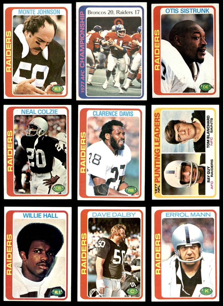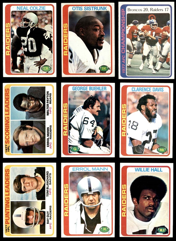 This set contains the following cards 1978 Topps #8 Skip Thomas 7 - NM Front Back 1978 Topps #28 Jack Tatum 5 - EX Front Back 1978 Topps #50 Dave Casper 7 - NM Front Back 1978 Topps #68 Ted Hendricks 6 - EX/MT Front Back 1978 Topps #90 Gene Upshaw 5 - EX Front Back 1978 Topps #108 Clarence Davis 6 - EX/MT Front Back 1978 Topps #128 Dave Dalby 6 - EX/MT Front Back 1978 Topps #149 Phil Villapiano 6 - EX/MT Front Back 1978 Topps #167 AFC Championship 6 - EX/MT Front Back 1978 Topps #169 Neal Colzie 5 - EX Front Back 1978 Topps #189 Otis Sistrunk 5 - EX Front Back 1978 Topps #210 Errol Mann 7 - NM Front Back 1978 Topps #235 Mark Van Eeghen 5 - EX Front Back 1978 Topps #260 Ray Guy 7 - NM Front Back 1978 Topps #282 Monte Johnson 5 - EX Front Back 1978 Topps #305 Cliff Branch 7 - NM Front Back 1978 Topps #326 John Vella 7 - NM Front Back 1978 Topps #333 - Walter Payton / Mark van Eeghen Rushing Leaders PSA 8 - NM/MT Front Back 1978 Topps #334 - Walter Payton / Errol Mann Scoring Leaders 7 - NM Front Back 1978 Topps #336 - Ray Guy / Tom Blanchard Punting Leaders 6 - EX/MT Front Back 1978 Topps #345 Willie Hall 5 - EX Front Back 1978 Topps #365 Ken Stabler 7 - NM Front Back 1978 Topps #392 George Buehler 6 - EX/MT Front Back 1978 Topps #415 Fred Biletnikoff 6 - EX/MT Front Back 1978 Topps #439 John Matuszak 6 - EX/MT Front Back 1978 Topps #460 Art Shell 5 - EX Front Back 1978 Topps #481 Dave Rowe 6 - EX/MT Front Back 1978 Topps #520 - Mark van Eeghen / Dave Casper / Jack tatum / Neal Colzie Raiders Leaders & Checklist 7 - NM Front Back This 1978 Topps Oakland Raiders Team Set contains the 1978 Topps Raiders football cards and makes a great gift for any Raiders fan. ?With an inventory of over 15,000 team sets, Dean's Cards has Team Sets & Near Team Sets for just about every team, in multiple conditions, for all sports, for most major sets issued between 1909 and 1979.