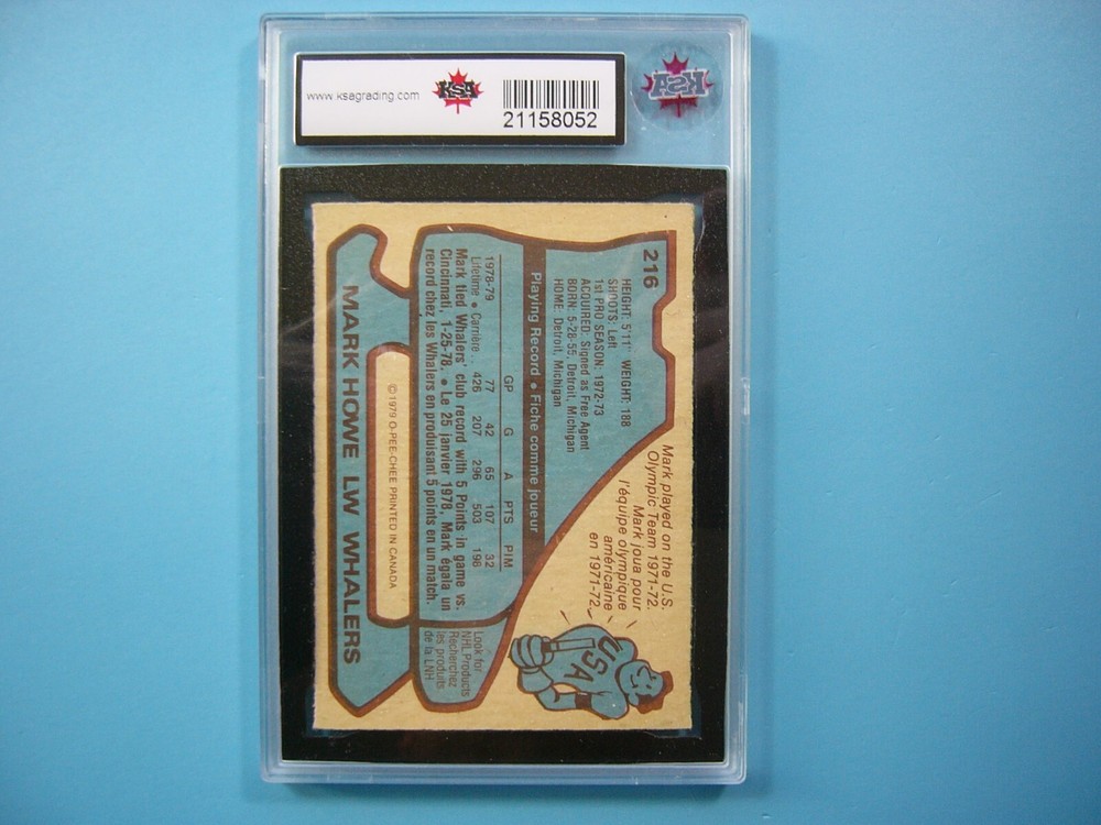 YOU ARE BIDDING ON A 1979/80 O-PEE-CHEE NHL HOCKEY CARD #216 MARK HOWE, HARTFORD WHALERS. CARD IS GRADED 10 BY KSA IN GEM MINT CONDITION. SEE SCANS FOR FURTHER CONDITION. GREAT COLOUR & GLOSS--A SUPER SHARP, CLEAN & ATTRACTIVE IMPORTANT & VERY POPULAR CARD FROM THIS VALUABLE O-PEE-CHEE HOCKEY SET!!! THANKS FOR LOOKING!!! -------------------------------------------------------------------------------------------------------------------------------- SHIPPING WITH TRACKING AND INSURANCE WITHIN CANADA IS $12.50, TO THE UNITED STATES $15.00 AND INTERNATIONALLY $55.00 (EVERYWHERE ELSE). ITEM WILL BE CAREFULLY PACKAGED SO AS NOT TO GET DAMAGED DURING SHIPPING. WE DO COMBINE SHIPPING ON MULTIPLE PURCHASES--ONLY 50 CENTS PER ADDITIONAL GRADED CARD OR ONLY 20 CENTS MORE PER ADDITIONAL SINGLE UNGRADED PHOTO OR CARD. TAKE A LOOK AT OUR OTHER AUCTIONS AND SAVE ON SHIPPING!!!