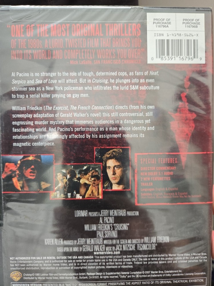 Movie/TV Title: Cruising Country/Region of Manufacture: United States Case Type: Tall/DVD Case Language: English Modified Item: No Release Year: 1980 Studio: Warner Bros Former Rental: No Cinematic Movement: Cult Rating: NR Type: Movie Video Format: NTSC Aspect Ratio: 16:9 Actor: Al Pacino Region Code: DVD: 1 (US, Canada...) Features: Commentary, Widescreen Format: DVD Genre: Drama Run Time: 102 mins Sub-Genre: Thriller, Serial Killer