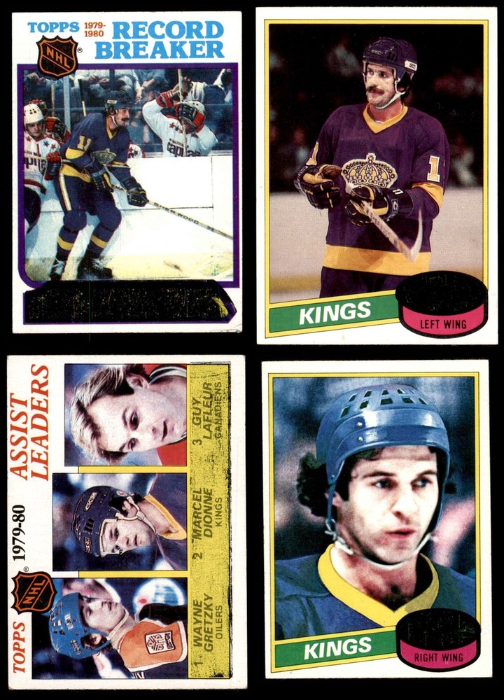 This set contains the following cards 1980 Topps #4 - Charlie Simmer Record Breaker 5 - EX Front Back 1980 Topps #20 Marcel Dionne 6.5 - EX/MT+ Front Back 1980 Topps #46 Billy Harris 5 - EX Front Back 1980 Topps #81 - Marcel Dionne All-Star 5 - EX Front Back 1980 Topps #83 - Charlie Simmer All-Star 4 - VG/EX Front Back 1980 Topps #104 Rob Palmer 4 - VG/EX Front Back 1980 Topps #137 Dave Taylor 4 - VG/EX Front Back 1980 Topps #162 - Wayne Gretzky / Marcel Dionne / Guy Lafleur Assists Leaders 4 - VG/EX Front Back 1980 Topps #165 - Charlie Simmer / Marcel Dionne / Danny Gare Power Play Goal Leaders 4 - VG/EX Front Back 1980 Topps #171 - Charlie Simmer Kings Leaders 5 - EX Front Back 1980 Topps #196 Dave Lewis 5 - EX Front Back 1980 Topps #207 Doug Halward 4.5 - VG/EX+ Front Back 1980 Topps #240 Charlie Simmer 6 - EX/MT Front Back This 1980 Topps Los Angeles Kings Almost Complete Team Set contains the majority of the 1980 Topps Los Angeles Kings cards and would make the perfect gift for any Los Angeles Kings fan. With an inventory of over 15,000 Almost Complete Team Sets, Dean's Cards has Almost Complete Team Sets & Near Almost Complete Team Sets for just about every team, in multiple conditions, for all sports, for most major sets issued between 1909 and 1980 .Where applicable, expensive and rare short-print cards have been excluded from this set. Set breakdown by grade: Number of Cards in Set 13 Average Grade - Weighted by Value 4.95 - EX Average Grade - Unweighted 4.77 - EX Grade Breakdown 6.5 - EX/MT+ 1 6 - EX/MT 1 5 - EX 5 4.5 - VG/EX+ 1 4 - VG/EX 5 This almost complete set contains 13 cards out of the possible 15 cards. This is not a complete set. This set does not include the following cards: #161 Goal Leaders - Danny Gare / Charlie Simmer / Blaine Stoughton, #163 Scoring Leaders - Marcel Dionne / Wayne Gretzky / Guy Lafleur Dean's Cards offers a 100% Money Back Satisfaction Guarantee on all purchases. Just contact us within 10 days of the purchase date and we will refund your money or, when possible, replace the cards. 1980-81 Topps Los Angeles Kings Almost Complete Team Set Kings-Hockey 5 - EX 6900683 (13 / 15 cards) If the scan in the listing says ACTUAL IMAGE, you will receive the card pictured. For cards issued after 1983, we will often use representative images and you will not receive the exact card pictured. Shipping Policy You only pay shipping on the first item. If you order multiple items on the same order, you will only be charged once for shipping. We do not combine shipping on multiple orders. To avoid multiple shipping charges we recommend using eBay's "Add to Cart" feature to check out multiple items in one transaction, or please request and allow for us to send an invoice to reflect the combined shipping charges. Canadian customers - We send all of our Canadian/International packages with tracking and cannot make any exceptions to this policy. Negotiating Prices All prices are final and we do not negotiate. This policy is to ensure that everyone knows that they are getting our best possible price. So please do not ask us to negotiate on price. Return Policy Dean's Cards has a 100% Money Back Satisfaction Guarantee on all purchases, as long as the product is returned within 30 days of receiving the product. Card Grading Each card is first reviewed by a member of our team, in order to detect any flaws that may not be visible on a scan, such as wrinkles, creases, print spots, or light stains. The vast majority of our vintage cards are professionally graded by the Dean's Cards Grading Software and include a 100% satisfaction guarantee. Our grading is on par with PSA standards when it comes to corners, centering and flaws - and tends to grade a bit tougher than PSA, on cards with a tilted image or rough edges. This grading software was developed to provide far better grading and consistency than can be achieved using the human eye. Determining the card's grade The sharpness of the corners and the degree to which a card was cut off-center determines the maximum possible grade that the card can receive. The card's grade is further reduced by any flaws or blemishes that it may have. Each card is evaluated on the following characteristics and assigned a score. Corners - Each corner of a card is individually analyzed, and then assigned a score on how square, sharp, and flawless it appears. Centering - The borders are measured, at multiple points along the edge, to determine the horizontal and vertical centering and tilt. Defects - The card is examined for imperfections, such as: size, print flaws, dings, stains, creases, or other wear which could lower its grade. Bonus for Perfect Centering - A vintage card, with near perfect centering, is given a one-half grade bonus. So when you buy one of our cards with a half-grade (e.g. 3.5 or 6.5) it will appear perfectly centered, both vertically and horizontally. Grading Criteria Worst Corner - A card can grade only as high as the worst corner will allow. Average Corner Tilt - The difference in width of a card border near the top, compared to the bottom. OCT - The sum of how far a card is Off-Center, plus its Tilt. Minimum Centering Requirements Eye Appeal - The combination of a card's centering, corners and tilt. Well-Centered - Cards that appear perfectly centered receive a bonus of one-half grade. Flaws, defects and other imperfections - can lower a card's grade. Card Backs - the above criteria is also considered, for the back of the cards, but does not inflict as severe of a penalty to its grade. Packaging Once scanned, the cards are placed in "soft" sleeves, which have an open top for easy removal. The Dean's Cards label is placed on the top back of the card sleeve. Every card you buy features a QR Code that you can scan to see your ACTUAL CARD and its grading statistics. Please note that when images are enlarged there may be instances of vertical lines running through the scans. This was caused by a "dust speck" on the scanner and