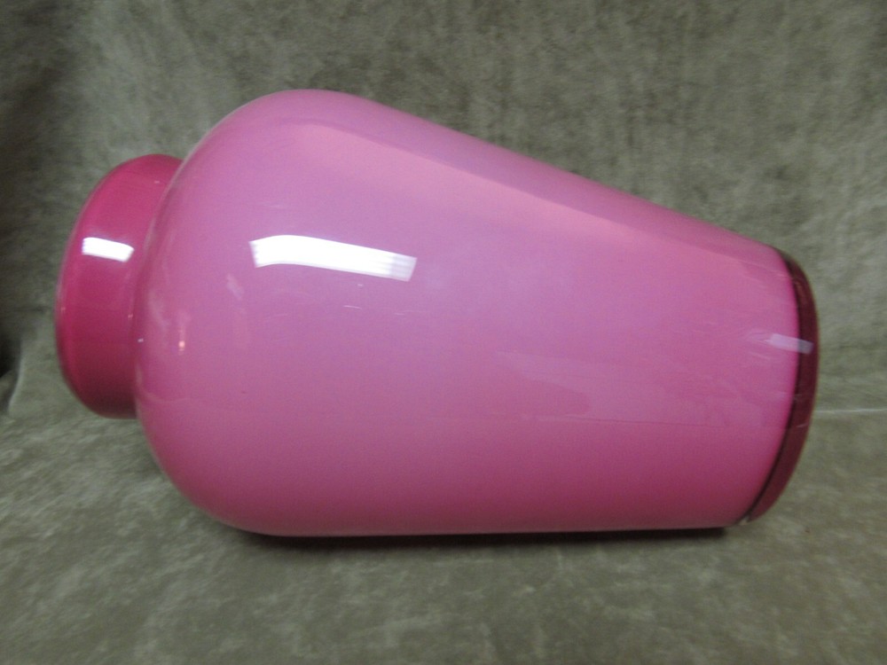 This vase has NO MARKING, it cased white on the inside, pink and then clear on the outside. Made by Fenton in 1983, it is a factory second that has an air bubble at the shoulder, see photos, can be felt as open on the inside. This was the mold blown piece and has a polished/ground top edge. This measures 7" at the widest and is 11-1/4" tall. Good condition, no damage or issues-just the bubble at the shoulder.