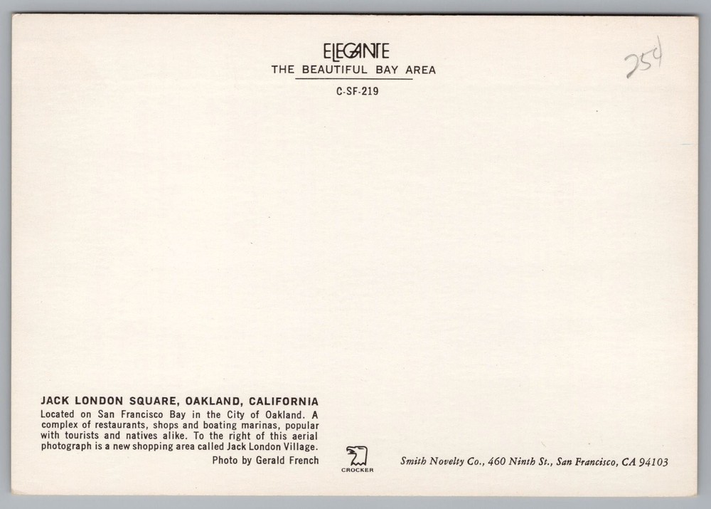 This vibrant photochrome postcard showcases an aerial view of Jack London Square in Oakland, California, a bustling waterfront area on San Francisco Bay. The image captures the lively marina filled with boats and yachts, alongside the dynamic cityscape of Oakland with its distinct skyline and surrounding hills. Taken by noted photographer Gerald French, this postcard highlights the unique blend of urban and maritime life that defines this popular tourist and local destination. Produced by Smith Novelty Co. and part of the Elegante 'The Beautiful Bay Area' series (C-SF-219), this postcard dates from the photochrome era (1939 to now), reflecting a high-quality color printing technique that brings out vivid details and rich hues. The card measures a continental 6 x 4 inches and is ideal for collectors interested in California landmarks, coastal scenes, or mid-20th-century American postcards. The back includes descriptive text about Jack London Square and points to the nearby Jack London Village shopping area, adding historical context and collectible appeal. SHIPPING COST: ALL ORDERS ARE EXPIDITED, ORDERS ARE TYPICALLY SHIPPED WITHIN TWO HOURS OF MY RECEIPT OF PAYMENT UNLESS I AM OUT OF TOWN SOURCING NEW ITEMS OR MY STORE IS IN VACATION MODE BOTH OF THESE MITIGATING FACTORS ARE RARE. SEE MULTIPLE SCANS OF ITEM. Please use eBay magnifier for a more detailed view of the item. CONDITION: Moderate wear and some soiling. Combined shipping always available on multiple items. PLEASE USE THE E-BAY SHOPPING CART AS IT MAKES COMBINED SHIPPING EASIER TO SEE. Thank you! I have a great passion for collecting postcards, photographs and ephemera. My store offers many rare and hard to find items as well as always being able to guarantee their authenticity as vintage and genuine. Each week I will be posting rare, unusual, high-quality and unique items for the advanced, intermediate and beginning collector. Our items are ALWAYS vintage. Please bookmark our store and I look forward to helping you build your collections!