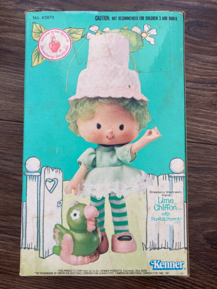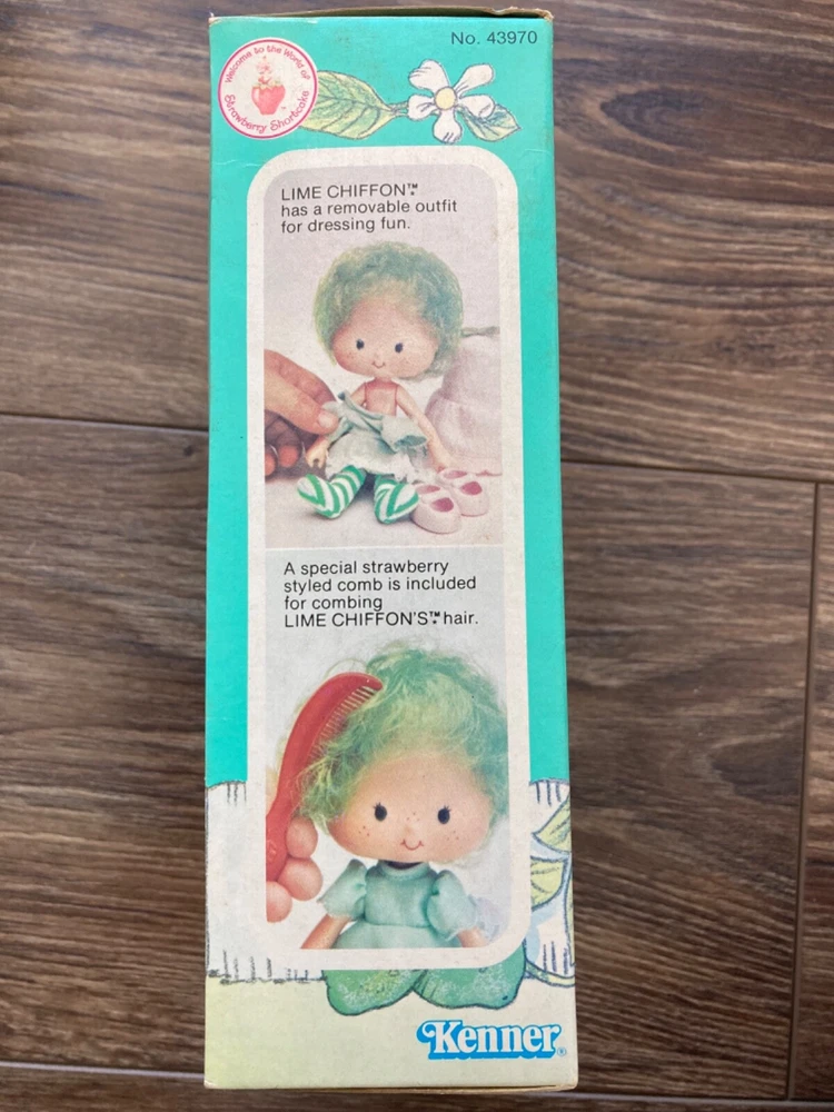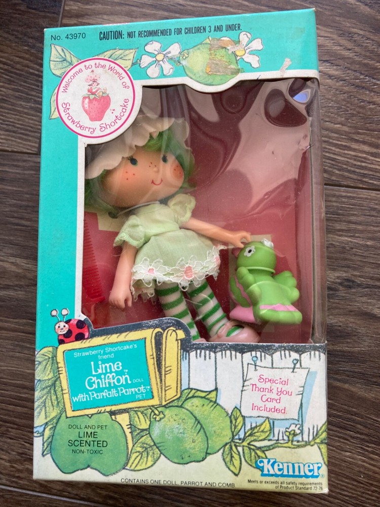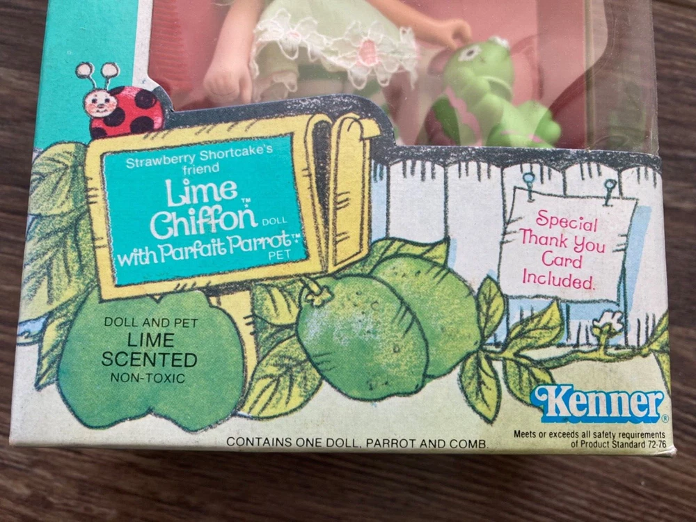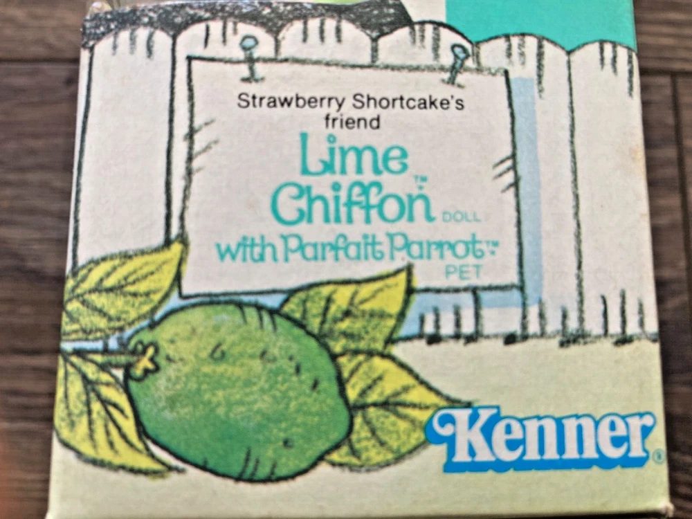 HOOKED-ON-VINTAGE IS SO PLEASED TO OFFER THIS ORIGINAL VTG 1980s Kenner Strawberry Shortcake Lime Chiffon Doll & Parfait Parrot TOY BOX ESTATE BOUGHT, NEW / UNUSED, 45 YEARS OLDS NOS NEW OLD STOCK. THE BOX HAS FADED BY AGE - SOLD AS SHOWN IN THE SUPER-SIZED PHOTOS. WE HAVE LOADS OF FUN VINTAGE VINYL RECORDS, VINTAGE GOODIES, AND ANTIQUE ITEMS FOR SALE IN OUR EBAY STORE AS WELL. WE LOVE TO COMBINED SHIPPING TO SAVE OUR EBAY CUSTOMERS MONEY = LIFE IS SHORT ... SO, BUY ALL YOU WANT! REAL RARE, REAL VINTAGE! READY TO ENJOY! COMES FROM A NON-SMOKING HOME. WE DO COMBINED SHIPPING TO SAVE YOU MONEY. CHECK OUR POSITIVE FEEDBACKS AND BID WITH CONFIDENCE! WE CAN COMBINED SHIPPING TO SAVE YOU MONEY, SO BID ON AS MANY AS YOU WOULD LIKE FOR YOUR COLLECTION.