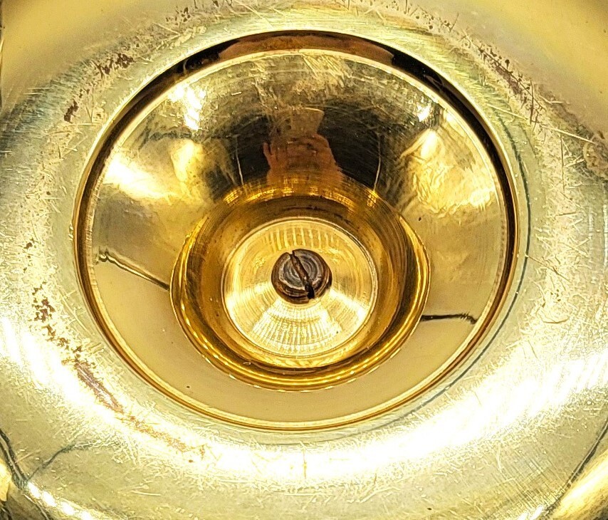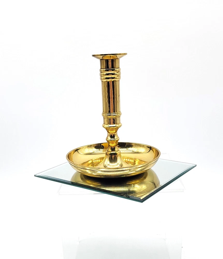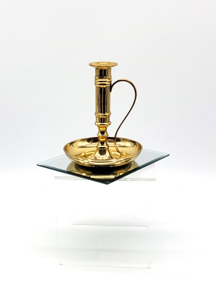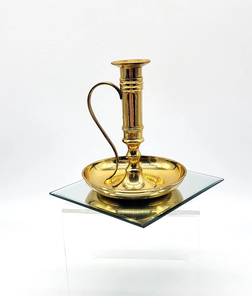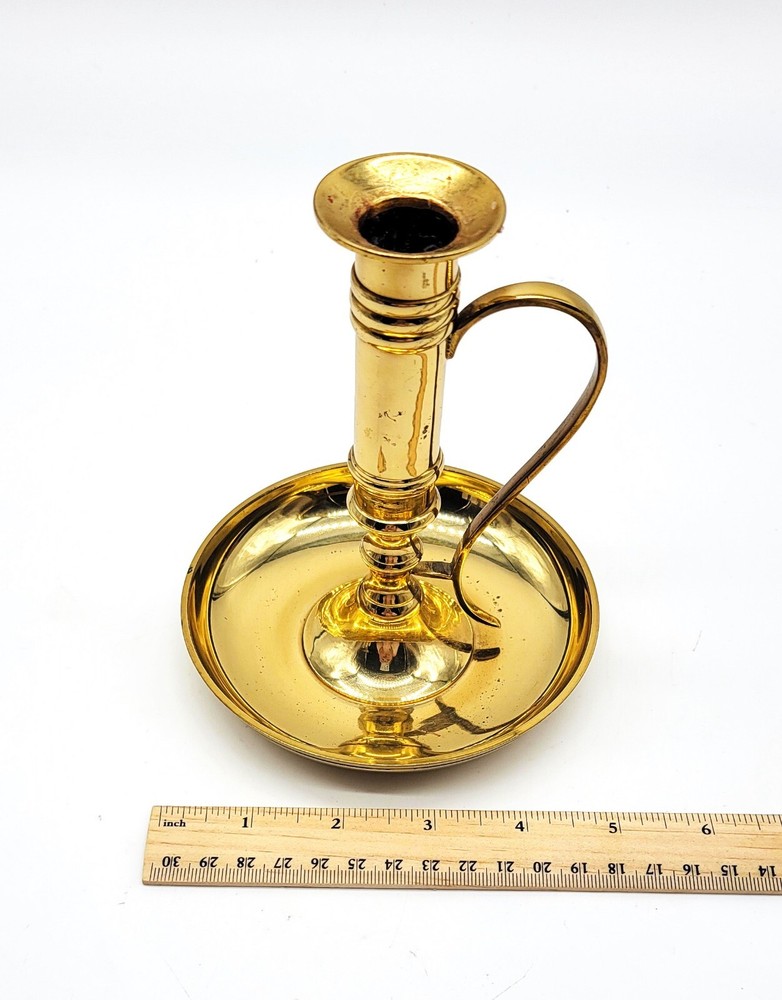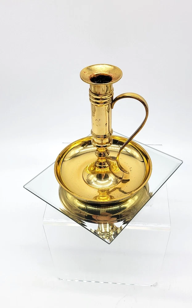 UNBRANDED STYLE: 1980s Colonial Classic Chamberstick Candleholder. MATERIAL: Gold Brass, Coated SIZE: Approximately 6" Tall and 5" Across. CONDITION: This is a classic, Colonial style Chamberstick Candleholder with curved handle from the 1980s. It is solid coated brass and is very nice quality. The circular base is attached with a nut and screw bottom. I have not attempted to polish it and have left that choice up to the taste of the buyer. It is an elegant piece and would look well in any decor. I have found no signs of dents or cracks in the item. Thank you for shopping with me and have a lovely day!!