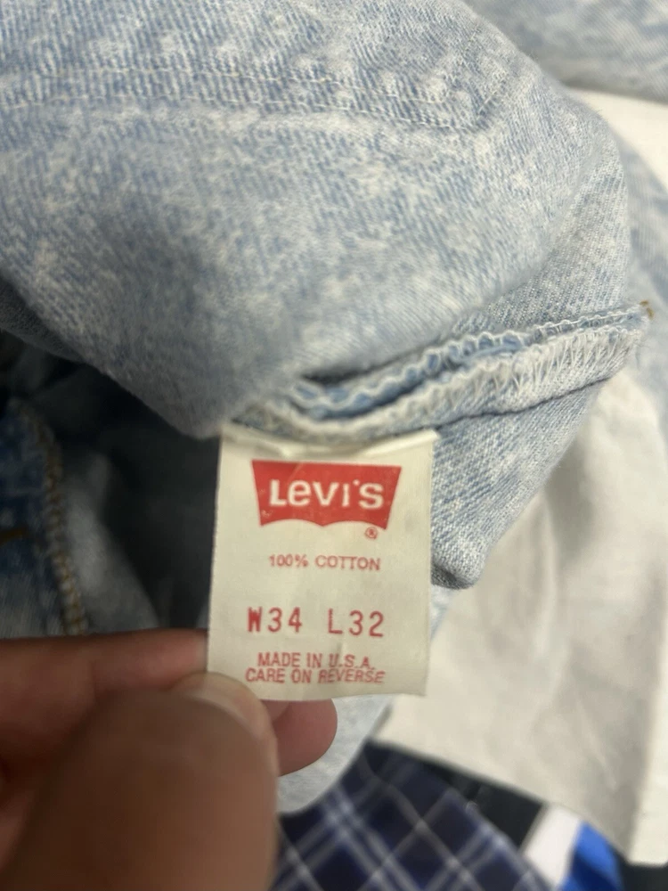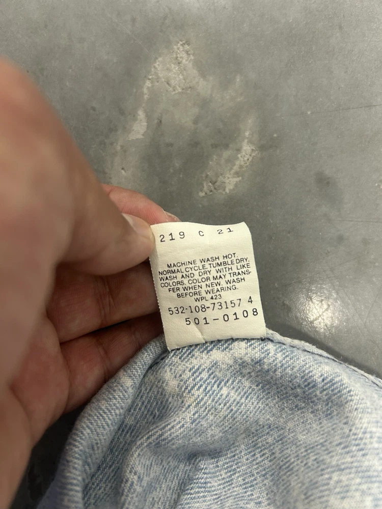 1980s Vintage Levi's 501 Button Fly Jeans in White Acid Wash, size 30x32. Made of denim, featuring a regular fit and a straight style. These distressed jeans have pockets, a vintage look, and a USA theme. The jeans are from the United States and are a unisex design.