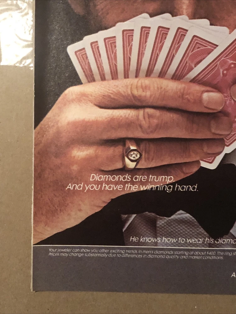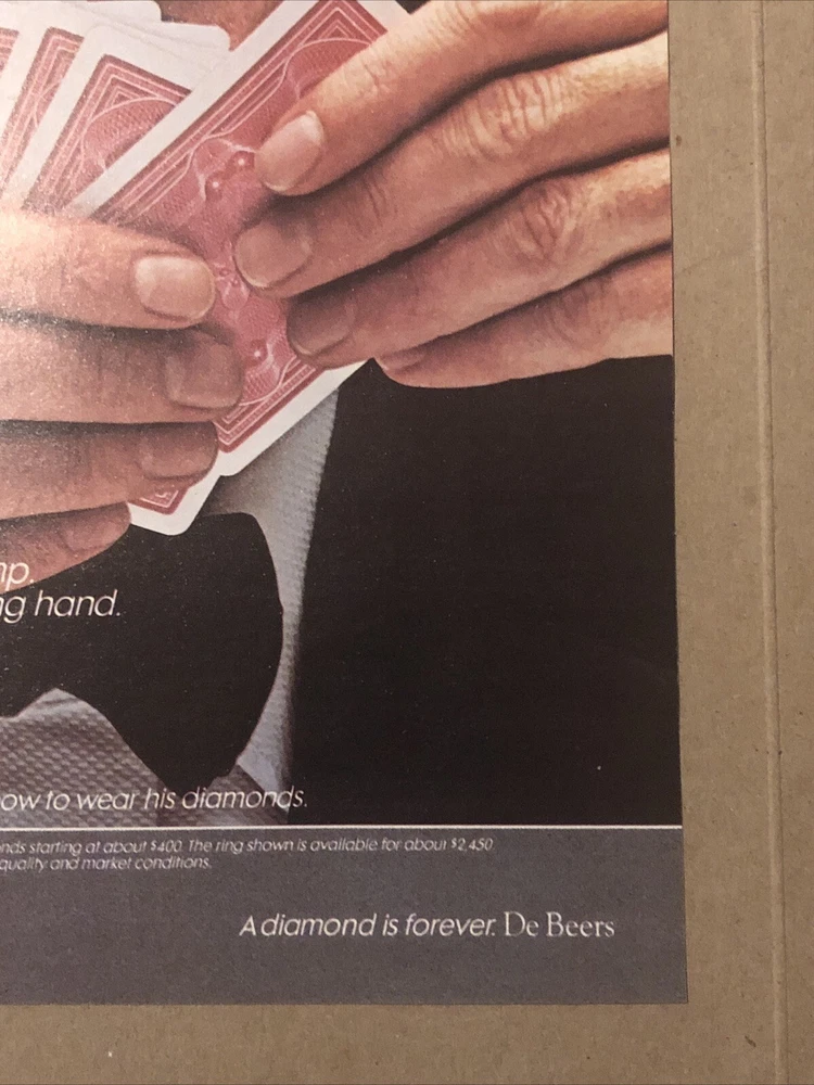 This vintage 1981 De Beers Diamond Forever print ad is a must-have for any jewelry and watch enthusiast or collector of advertising memorabilia. The ad features a multi-color design with the iconic "A Diamond Is Forever" slogan and measures approximately 8"x11" in page measurements. The ad is an original piece from the United States and was created in 1981, making it a rare find from the 1980s. It is perfect for anyone who loves vintage advertising and jewelry. Don't miss out on the opportunity to add this unique piece to your collection.