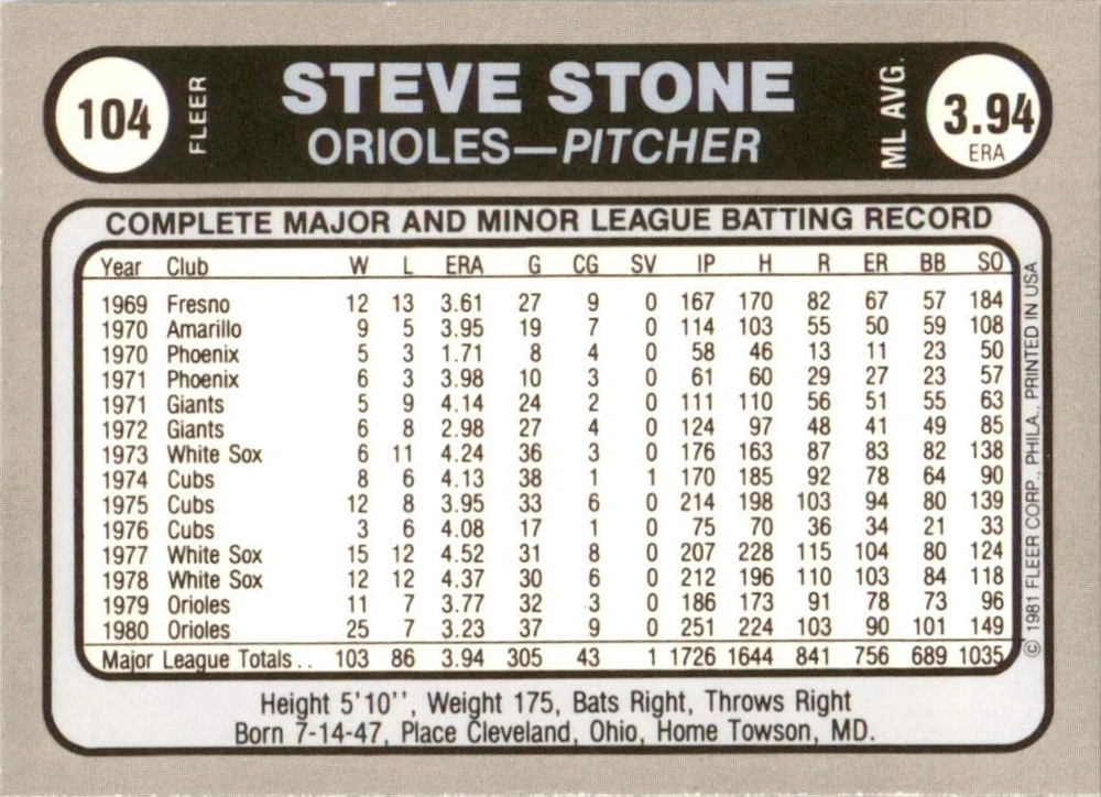 1981 Fleer Star Stickers #104 Steve Stone Baltimore Orioles Condition: EX-MT