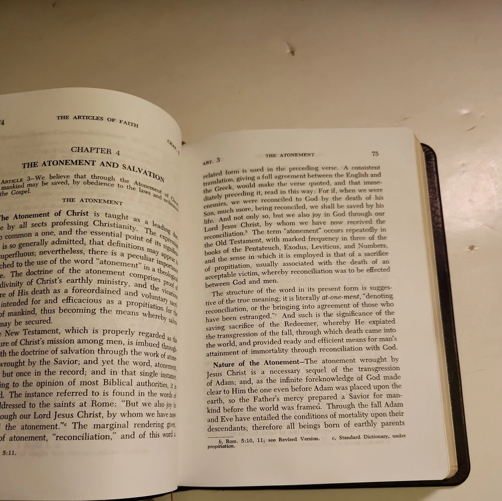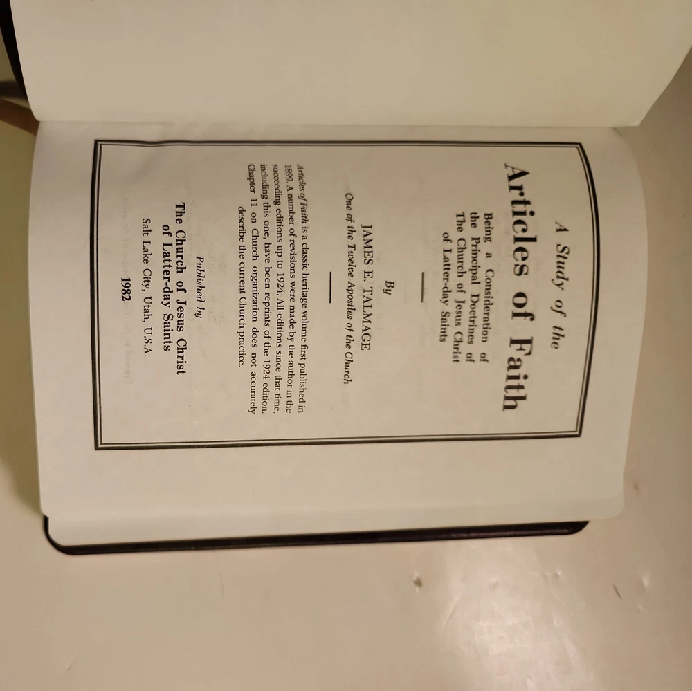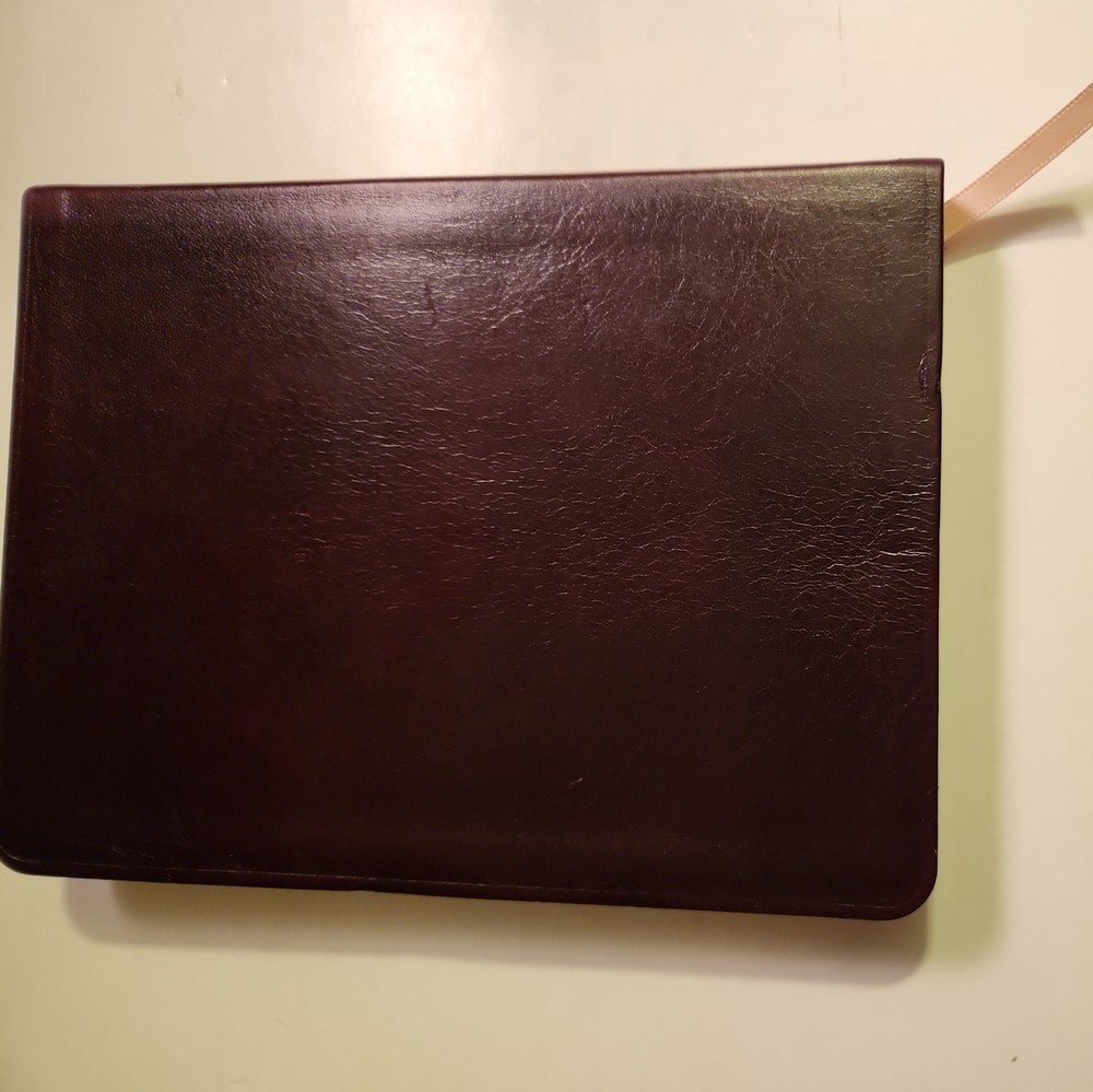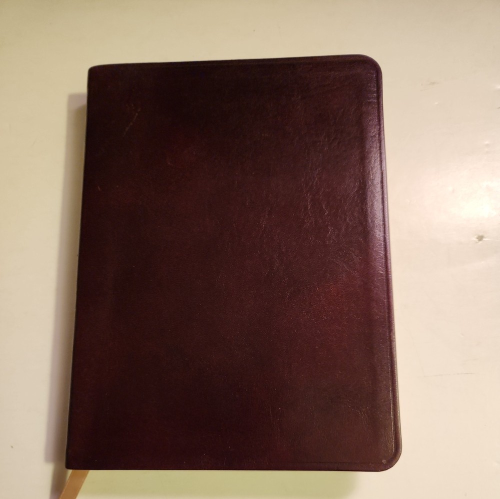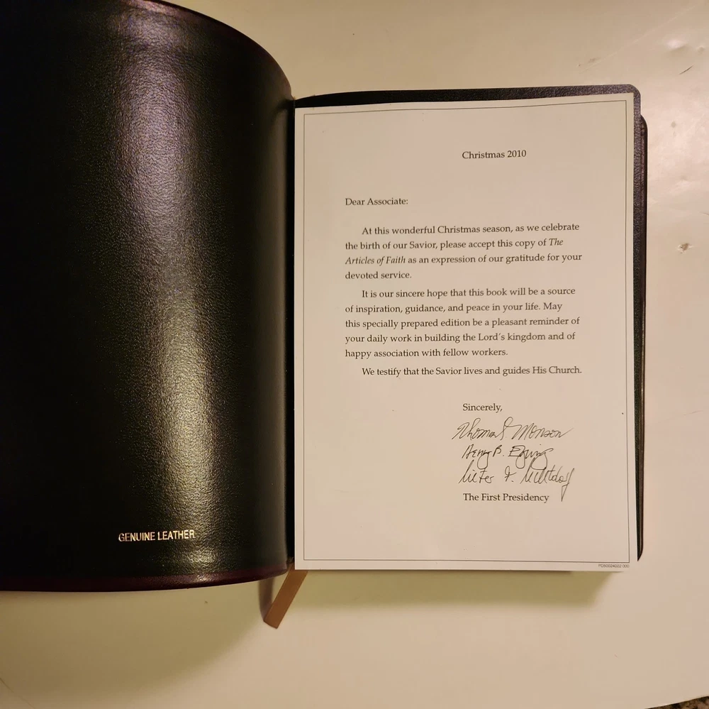 this is a new bendable dark brown leather articles of faith. no box but has paper. slight handling wear. clean text.