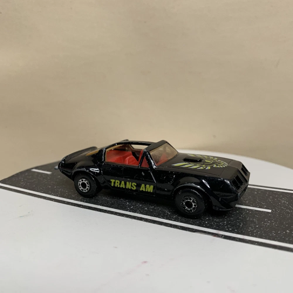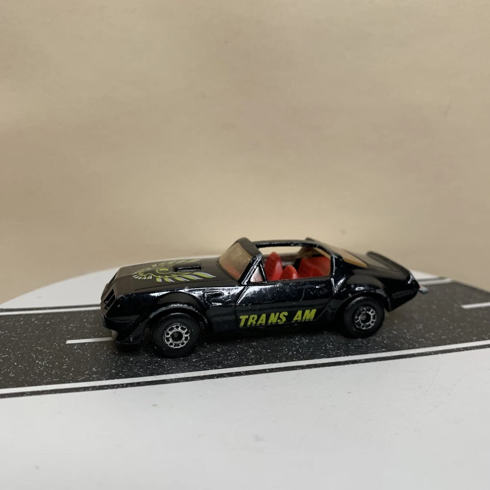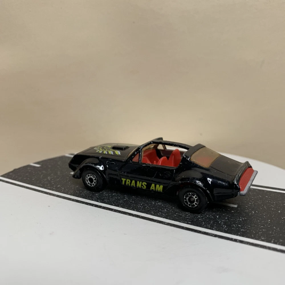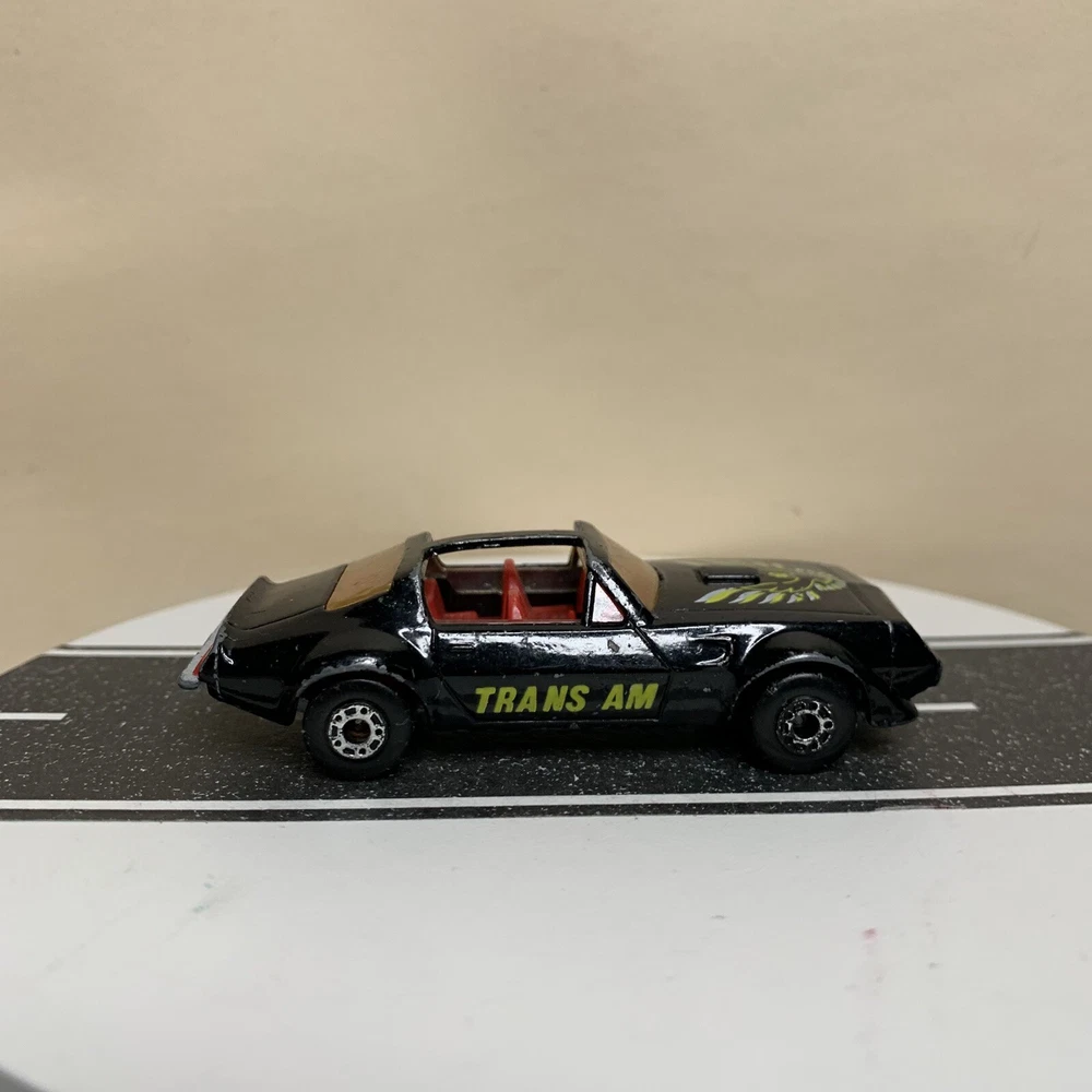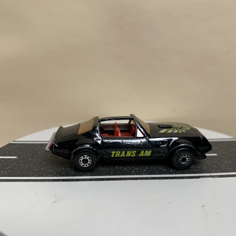 Material:DiecastVehicle Type:CarSeries:Matchbox SuperfastVehicle Make:PontiacVehicle Year:1982Year of Manufacture:1982Model:Pontiac Firebird Trans AmBrand:MatchboxColor:Black