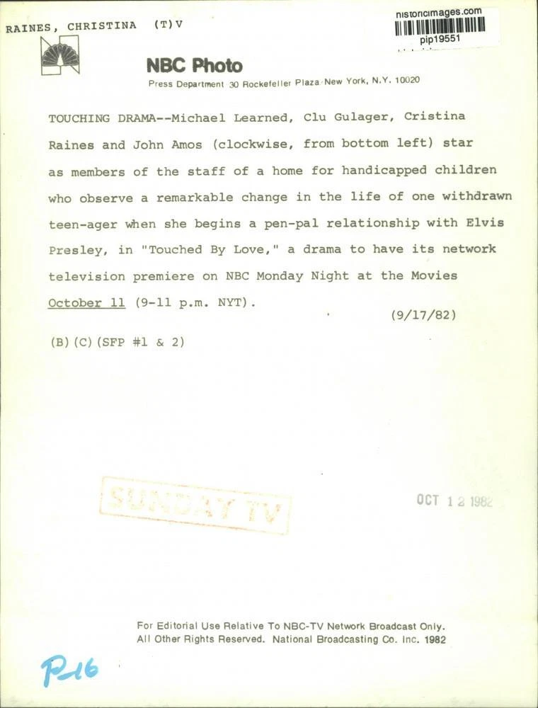ebay template Note: Please study the images carefully to determine the condition of this vintage photograph, as it may not be in perfect condition. It may contain wrinkles, cracks, and possibly even tears due to its age and how it was handled before it got to us. A scanner may interpret colors and contrast differently than human eyes will, so it is possible that the actual photograph may be slightly darker or lighter in person. This vintage photograph is offered for sale as a collectible item and conveys no transfer of copyright. 1982 Press Photo The cast members of "Touched By Love," on NBC Television. This is an original press photo. TV - Michael Learned, Clu Gulager, Cristina Raines and John Amos (clockwise, from bottom left) star as members of the staff of a home for handicapped children who observe a remarkable change in the life of one withdrawn teenager when she begins a pen-pal relationship with Elvis Presley, in "Touched By Love," a drama to have its network television premiere on NBC Monday Night at the Movies.Photo measures 7 x 9.25inches. Photo is dated 9-17-1982. PHOTO FRONT PHOTO BACK Historic Images Part Number: pip19551 FAQs Q: Can I just download a digital version instead? A: No, we sell only vintage originals and do not make or distribute any copies, including digital ones. Q: Do you combine shipping and invoices? A: Multiple photos won on the same seller ID combine automatically through the eBay checkout process. If you encounter problems with this, send us a message via eBay messaging and we will send you an invoice. Due to eBay limitations, we cannot combine items won on our different seller IDs for a single shipping charge. Q: How quickly do you ship the items once paid? A: We ship within one business day after your payment clears. If you do not receive an "order shipped" email from us by the close of the second business day from submitting payment, please e-mail us via eBay messaging. Q: How do you make sure my photograph arrives safely? A: We package each order between two cross-corrugated pieces of cardboard to ensure that the package is as difficult to bend as possible. We then wrap each order in a plastic sheet to help protect against moisture. We want you to rest assured that we take every precaution to ensure that the photograph you receive will be in the same condition in your care as it was in ours. Q: Will the "Historic Images" watermark be on my photo when I receive it? A: No. This is a digital watermark we use to protect our images. It is not printed on the photo. Q: What are your office hours? A: eBay for us is a business, and a very fun one to be in! We are open M-F 9 to 5 (CST). Therefore, we do not return e-mails and phone calls over the weekend. We observe the following holidays: New Years Day, Memorial Day, Fourth of July, Labor Day, Thanksgiving and the day after Thanksgiving, Christmas Eve and Christmas Day. Q: Where did all these vintage photos come from? A: These original vintage photographs are from various news service and newspaper photo archives from locations around the country including: Boston, Detroit, Tampa, Chicago, Denver, Seattle, New Orleans, Milwaukee, Portland, Spokane, and more. We do not copy or reproduce any photographs -- every item is a unique vintage piece that was housed in a news archive. Q: Can I use this photograph in my book/blog/website? A: The short answer is no. There is no transfer of copyright for republication or reproduction with these photographs when you purchase them, and only photographs taken before 1923 are currently automatically in the public domain. Permission from the copyright holder, which usually can be identified from the back of each photo, must be sought to republish or reproduce the image for any purpose. Q: Do you relist items (in case I miss an auction ending)? A: Auction items that receive no bids are relisted in our store (historicimages-store on eBay) as a fixed-price item and at a higher price than the starting auction price. Q: Do you leave feedback? A: Yes, we always leave feedback for buyers. Our software monitors when our buyers leave us feedback, then notifies us that we can leave feedback for the buyer. Rest assured, if you leave feedback, we will do the same! Check out our family of eBay IDs: historicimages01 Sports Photos historicimages02 Entertainment Photos historicimages03 Americana Photos historicimages04 International & War Photos historicimages05 Transportation Photos historicimages06 Photos of All Subjects historicimages07 Entertainment Photos historicimages08 Newsworthy Photos historicimages09 Entertainment Photos historicimages10 Sports Photos historicimages-store Our largest fixed-price selection historicimages-gallery Hand-picked photos Saturday night auctions About Us Historic Images was formed in September 2009, with a handful of scanners working out of a basement to digitize newspaper photo archives. We have since moved out of the basement, and we can now archive thousands of photos per day. Our company has worked with magazines and newspapers from Detroit, Boston, Denver, Seattle, Tampa, Chicago, and New Orleans, just to name a few. We are constantly adding to our inventory, and have assembled an archive of millions of photos to date. As our company evolved, we began our eBay business, which brings thousands of fresh auctions per week to the world's largest online auction marketplace. Our custom software systems and team of great employees allow us to efficiently scan and sell large photo archives online. At the very core of our company's DNA is a strong commitment to customer satisfaction and strict integrity for our product. Our promise to you is that we will do everything in our power to provide you a great buying experience. Copyright 2009 - Present, Historic Images, Inc. Sell Smarter with Kyozou. Inventory and Ecommerce Management