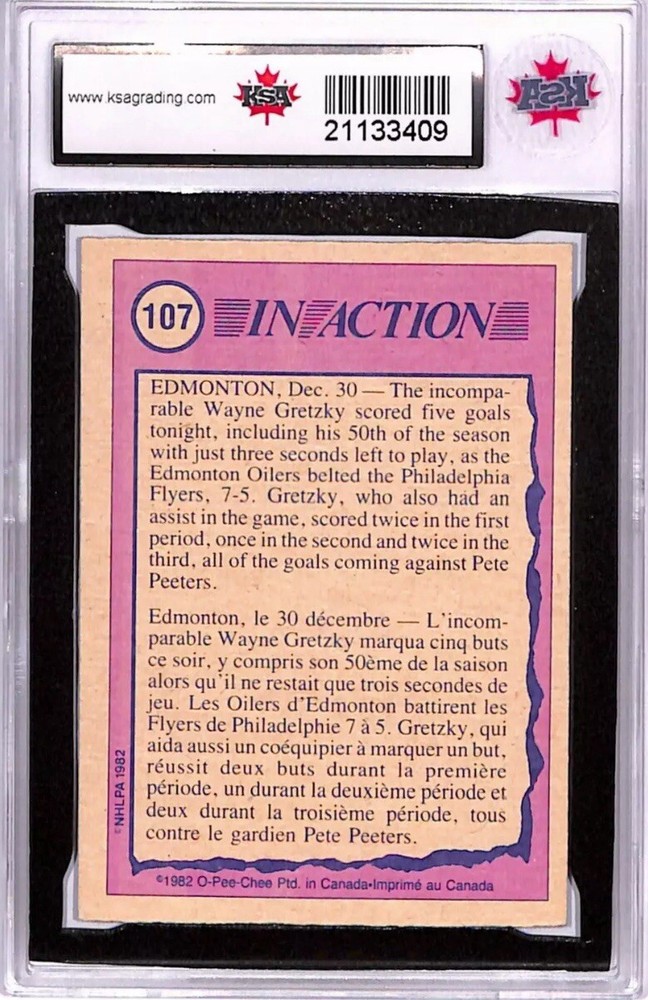 1982-83 O-Pee-Chee NHL Hockey #107 featuring Wayne Gretzky in action. This vintage trading card is a graded KSA 10 GEM MINT, ensuring its pristine condition. A must-have for any Edmonton Oilers or Wayne Gretzky fan, this card is from the National Hockey League (NHL) set and is a rare find from the 1982-83 season. This card captures a timeless moment in ice hockey history. Add this original piece to your sports trading card collection today. Will ship fedex until Canada postal strike has ended .