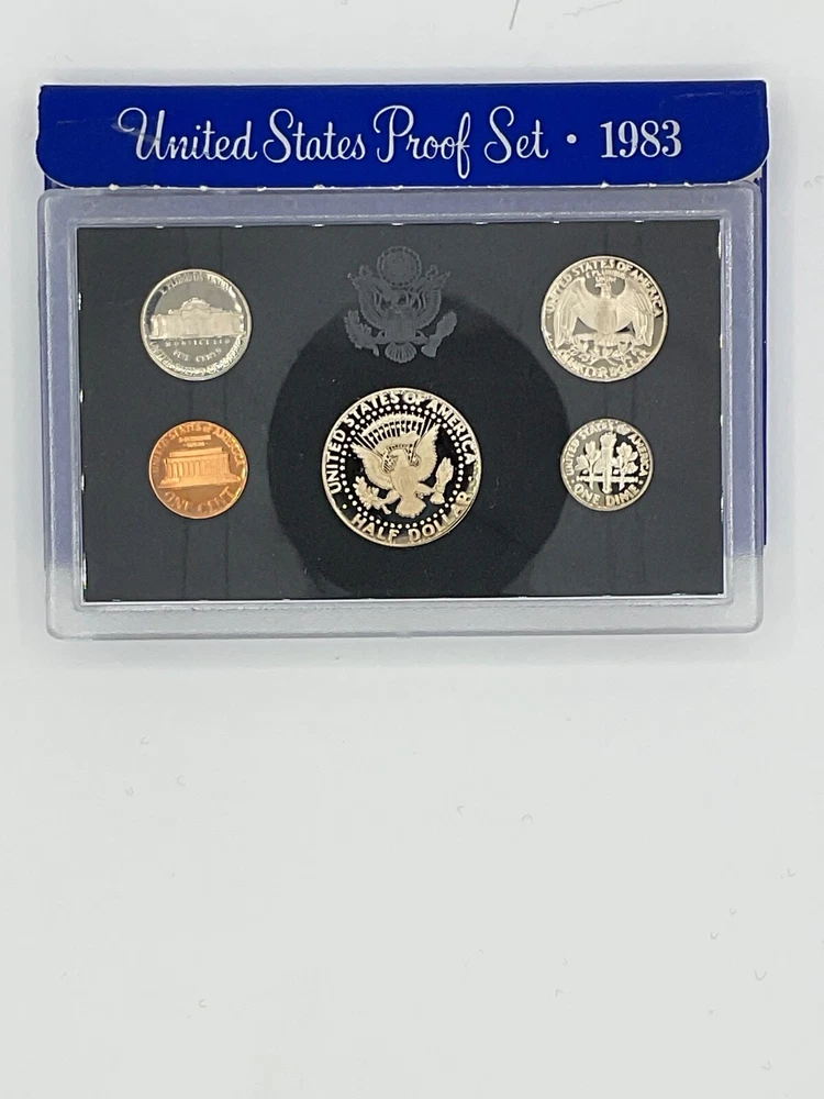 This is a 1983 Clad Proof Set from the U.S. Mint in its original government packaging. The set includes uncirculated coins with denominations of 1C, 5C, 10C, 25C, and 50C. The coins are composed of Copper-Plated Zinc and Copper-Nickel, with a proof strike type. They were minted in San Francisco and are certified by the U.S. Mint.