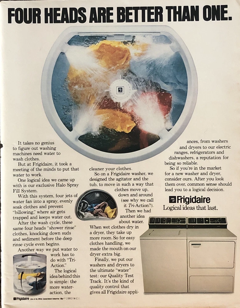 The product is a vintage 1983 Frigidaire Washer magazine print ad featuring the Halo Spray Fill System with four heads. The ad showcases the appliance in a multi-color design and promotes its features. It was created in the United States and measures approximately 10"x12". The ad highlights the innovative technology of the washer and is a collectible piece from the 1980s.