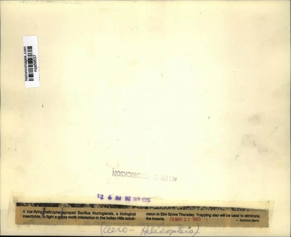 ebay template Note: Please study the images carefully to determine the condition of this vintage photograph, as it may not be in perfect condition. It may contain wrinkles, cracks, and possibly even tears due to its age and how it was handled before it got to us. A scanner may interpret colors and contrast differently than human eyes will, so it is possible that the actual photograph may be slightly darker or lighter in person. This vintage photograph is offered for sale as a collectible item and conveys no transfer of copyright. 1983 Press Photo Helicopter Sprays Bacillus Thuringlensis Insecticide This is an original press photo. A low flying helicopter sprayed Bacillus thuringlensis, a biological insecticide to fight a gypsy moth infestation in the Indian Hills subdivision in Elm Grove Thursday. Trapping also will be used to eliminate the insects.Photo measures 10 x 8inches. Photo is dated 05-27-1983. PHOTO FRONT PHOTO BACK Historic Images Part Number: mja59537 FAQs Q: Can I just download a digital version instead? A: No, we sell only vintage originals and do not make or distribute any copies, including digital ones. Q: Do you combine shipping and invoices? A: Multiple photos won on the same seller ID combine automatically through the eBay checkout process. If you encounter problems with this, send us a message via eBay messaging and we will send you an invoice. Due to eBay limitations, we cannot combine items won on our different seller IDs for a single shipping charge. Q: How quickly do you ship the items once paid? A: We ship within one business day after your payment clears. If you do not receive an "order shipped" email from us by the close of the second business day from submitting payment, please e-mail us via eBay messaging. Q: How do you make sure my photograph arrives safely? A: We package each order between two cross-corrugated pieces of cardboard to ensure that the package is as difficult to bend as possible. We then wrap each order in a plastic sheet to help protect against moisture. We want you to rest assured that we take every precaution to ensure that the photograph you receive will be in the same condition in your care as it was in ours. Q: Will the "Historic Images" watermark be on my photo when I receive it? A: No. This is a digital watermark we use to protect our images. It is not printed on the photo. Q: What are your office hours? A: eBay for us is a business, and a very fun one to be in! We are open M-F 9 to 5 (CST). Therefore, we do not return e-mails and phone calls over the weekend. We observe the following holidays: New Years Day, Memorial Day, Fourth of July, Labor Day, Thanksgiving and the day after Thanksgiving, Christmas Eve and Christmas Day. Q: Where did all these vintage photos come from? A: These original vintage photographs are from various news service and newspaper photo archives from locations around the country including: Boston, Detroit, Tampa, Chicago, Denver, Seattle, New Orleans, Milwaukee, Portland, Spokane, and more. We do not copy or reproduce any photographs -- every item is a unique vintage piece that was housed in a news archive. Q: Can I use this photograph in my book/blog/website? A: The short answer is no. There is no transfer of copyright for republication or reproduction with these photographs when you purchase them, and only photographs taken before 1923 are currently automatically in the public domain. Permission from the copyright holder, which usually can be identified from the back of each photo, must be sought to republish or reproduce the image for any purpose. Q: Do you relist items (in case I miss an auction ending)? A: Auction items that receive no bids are relisted in our store (historicimages-store on eBay) as a fixed-price item and at a higher price than the starting auction price. Q: Do you leave feedback? A: Yes, we always leave feedback for buyers. Our software monitors when our buyers leave us feedback, then notifies us that we can leave feedback for the buyer. Rest assured, if you leave feedback, we will do the same! Check out our family of eBay IDs: historicimages01 Sports Photos historicimages02 Entertainment Photos historicimages03 Americana Photos historicimages04 International & War Photos historicimages05 Transportation Photos historicimages06 Photos of All Subjects historicimages07 Entertainment Photos historicimages08 Newsworthy Photos historicimages09 Entertainment Photos historicimages10 Sports Photos historicimages-store Our largest fixed-price selection historicimages-gallery Hand-picked photos Saturday night auctions About Us Historic Images was formed in September 2009, with a handful of scanners working out of a basement to digitize newspaper photo archives. We have since moved out of the basement, and we can now archive thousands of photos per day. Our company has worked with magazines and newspapers from Detroit, Boston, Denver, Seattle, Tampa, Chicago, and New Orleans, just to name a few. We are constantly adding to our inventory, and have assembled an archive of millions of photos to date. As our company evolved, we began our eBay business, which brings thousands of fresh auctions per week to the world's largest online auction marketplace. Our custom software systems and team of great employees allow us to efficiently scan and sell large photo archives online. At the very core of our company's DNA is a strong commitment to customer satisfaction and strict integrity for our product. Our promise to you is that we will do everything in our power to provide you a great buying experience. Copyright 2009 - Present, Historic Images, Inc. Sell Smarter with Kyozou. Inventory and Ecommerce Management