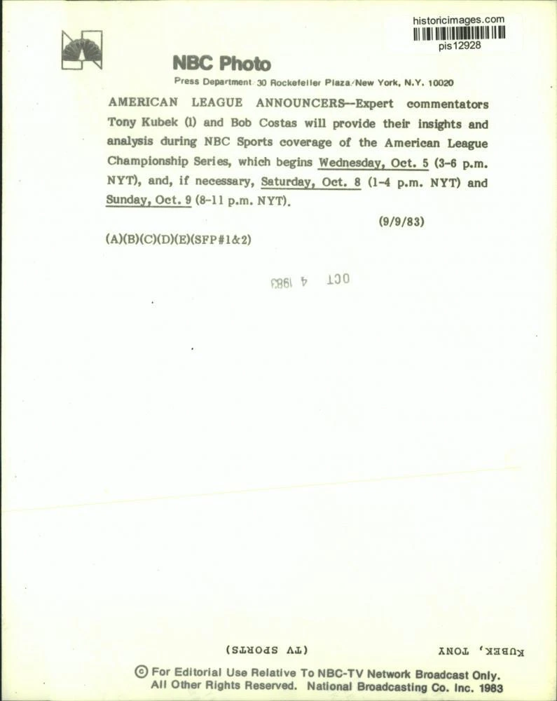 ebay template Note: Please study the images carefully to determine the condition of this vintage photograph, as it may not be in perfect condition. It may contain wrinkles, cracks, and possibly even tears due to its age and how it was handled before it got to us. A scanner may interpret colors and contrast differently than human eyes will, so it is possible that the actual photograph may be slightly darker or lighter in person. This vintage photograph is offered for sale as a collectible item and conveys no transfer of copyright. 1983 Press Photo NBC TV sportscasters Tony Kubek & Bob Costas - pis12928 This is an original press photo. Kubek, Tony (TV Sports). Expert commentators Tony Kubek (left) and Bob Costas will provide their insights and analysis during NBC Sports coverage of the American League Championship Series, which begins Wednesday, October 5 (3-6 p.m. NYT), and, if necessary, Saturday, October 8 (1-4 p.m. NYT) and Sunday, October 9 (8-11 p.m. NYT). Photo measures 9 x 7 inches. Photo is dated 9-9-1983. PHOTO FRONT PHOTO BACK Historic Images Part Number: pis12928 FAQs Q: Can I just download a digital version instead? A: No, we sell only vintage originals and do not make or distribute any copies, including digital ones. Q: Do you combine shipping and invoices? A: Multiple photos won on the same seller ID combine automatically through the eBay checkout process. If you encounter problems with this, send us a message via eBay messaging and we will send you an invoice. Due to eBay limitations, we cannot combine items won on our different seller IDs for a single shipping charge. Q: How quickly do you ship the items once paid? A: We ship within one business day after your payment clears. If you do not receive an "order shipped" email from us by the close of the second business day from submitting payment, please e-mail us via eBay messaging. Q: How do you make sure my photograph arrives safely? A: We package each order between two cross-corrugated pieces of cardboard to ensure that the package is as difficult to bend as possible. We then wrap each order in a plastic sheet to help protect against moisture. We want you to rest assured that we take every precaution to ensure that the photograph you receive will be in the same condition in your care as it was in ours. Q: Will the "Historic Images" watermark be on my photo when I receive it? A: No. This is a digital watermark we use to protect our images. It is not printed on the photo. Q: What are your office hours? A: eBay for us is a business, and a very fun one to be in! We are open M-F 9 to 5 (CST). Therefore, we do not return e-mails and phone calls over the weekend. We observe the following holidays: New Years Day, Memorial Day, Fourth of July, Labor Day, Thanksgiving and the day after Thanksgiving, Christmas Eve and Christmas Day. Q: Where did all these vintage photos come from? A: These original vintage photographs are from various news service and newspaper photo archives from locations around the country including: Boston, Detroit, Tampa, Chicago, Denver, Seattle, New Orleans, Milwaukee, Portland, Spokane, and more. We do not copy or reproduce any photographs -- every item is a unique vintage piece that was housed in a news archive. Q: Can I use this photograph in my book/blog/website? A: The short answer is no. There is no transfer of copyright for republication or reproduction with these photographs when you purchase them, and only photographs taken before 1923 are currently automatically in the public domain. Permission from the copyright holder, which usually can be identified from the back of each photo, must be sought to republish or reproduce the image for any purpose. Q: Do you relist items (in case I miss an auction ending)? A: Auction items that receive no bids are relisted in our store (historicimages-store on eBay) as a fixed-price item and at a higher price than the starting auction price. Q: Do you leave feedback? A: Yes, we always leave feedback for buyers. Our software monitors when our buyers leave us feedback, then notifies us that we can leave feedback for the buyer. Rest assured, if you leave feedback, we will do the same! Check out our family of eBay IDs: historicimages01 Sports Photos historicimages02 Entertainment Photos historicimages03 Americana Photos historicimages04 International & War Photos historicimages05 Transportation Photos historicimages06 Photos of All Subjects historicimages07 Entertainment Photos historicimages08 Newsworthy Photos historicimages09 Entertainment Photos historicimages10 Sports Photos historicimages-store Our largest fixed-price selection historicimages-gallery Hand-picked photos Saturday night auctions About Us Historic Images was formed in September 2009, with a handful of scanners working out of a basement to digitize newspaper photo archives. We have since moved out of the basement, and we can now archive thousands of photos per day. Our company has worked with magazines and newspapers from Detroit, Boston, Denver, Seattle, Tampa, Chicago, and New Orleans, just to name a few. We are constantly adding to our inventory, and have assembled an archive of millions of photos to date. As our company evolved, we began our eBay business, which brings thousands of fresh auctions per week to the world's largest online auction marketplace. Our custom software systems and team of great employees allow us to efficiently scan and sell large photo archives online. At the very core of our company's DNA is a strong commitment to customer satisfaction and strict integrity for our product. Our promise to you is that we will do everything in our power to provide you a great buying experience. Copyright 2009 - Present, Historic Images, Inc. Sell Smarter with Kyozou. Inventory and Ecommerce Management