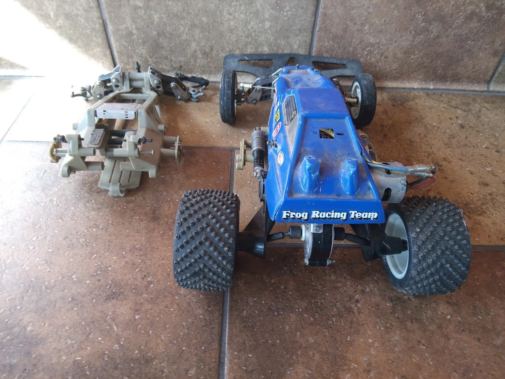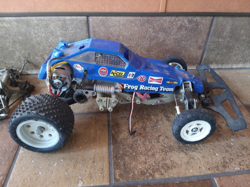1983 Tamiya Frog sold as a Parts Lot due to age. ESC works Fire Phoneix 320A, Hex drive and Differential is working. Electric Speed Controll came on the car, motor works,with Hi-Tech servo. Stock Oil Shocks, Hitec Servo. Sold as Parts, no haggle. r*t*r with your radio system! ;9). Extra chassis came with it and is included (available). Basically just need your 7.2V battery and radio system, on this classic Tamiya.