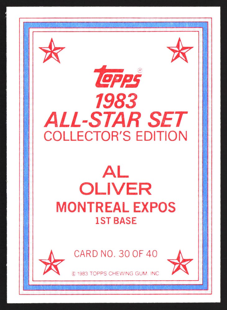 The Card pictured is the card you will receive unless there are multiple quantities then you will receive a card in the comparable grade. Cards in poor condition could have creasing, stains, rounded corners, pen marks or a combo of them. please see pics for a better understanding of cards condition. Very Good Montreal Expos 1983 All-Star Set Collector's Edition (Glossy Send-Ins) Al Oliver #30 1983 Topps Topps 1983 Baseball .