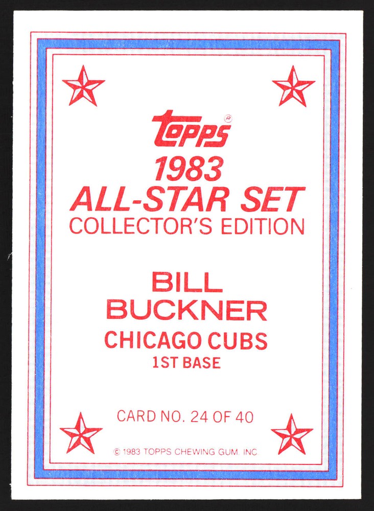 The Card pictured is the card you will receive unless there are multiple quantities then you will receive a card in the comparable grade. Cards in poor condition could have creasing, stains, rounded corners, pen marks or a combo of them. please see pics for a better understanding of cards condition. Very Good Chicago Cubs 1983 All-Star Set Collector's Edition (Glossy Send-Ins) Bill Buckner #24 1983 Topps Topps 1983 Baseball .