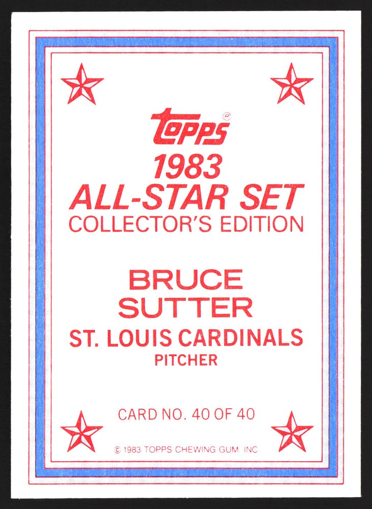 The Card pictured is the card you will receive unless there are multiple quantities then you will receive a card in the comparable grade. Cards in poor condition could have creasing, stains, rounded corners, pen marks or a combo of them. please see pics for a better understanding of cards condition. Very Good St. Louis Cardinals 1983 All-Star Set Collector's Edition (Glossy Send-Ins) Bruce Sutter #40 1983 Topps Topps 1983 Baseball .