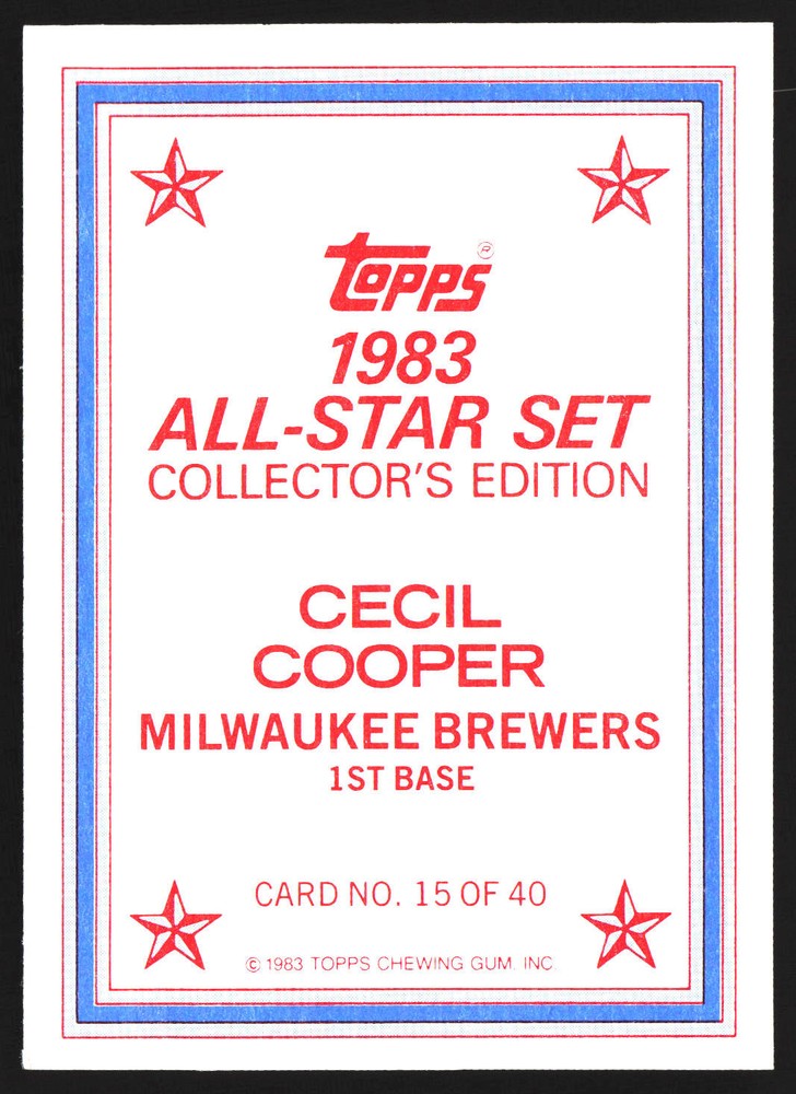 The Card pictured is the card you will receive unless there are multiple quantities then you will receive a card in the comparable grade. Cards in poor condition could have creasing, stains, rounded corners, pen marks or a combo of them. please see pics for a better understanding of cards condition. Very Good Milwaukee Brewers 1983 All-Star Set Collector's Edition (Glossy Send-Ins) Cecil Cooper #15 1983 Topps Topps 1983 Baseball .