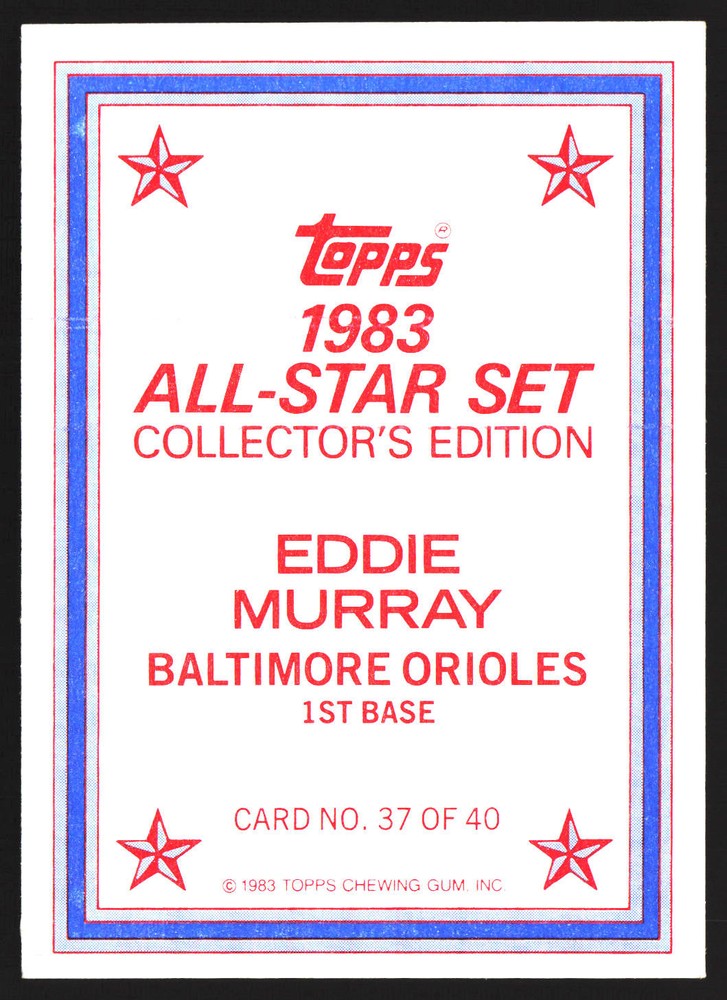 The Card pictured is the card you will receive unless there are multiple quantities then you will receive a card in the comparable grade. Cards in poor condition could have creasing, stains, rounded corners, pen marks or a combo of them. please see pics for a better understanding of cards condition. Very Good Baltimore Orioles 1983 All-Star Set Collector's Edition (Glossy Send-Ins) Eddie Murray #37 1983 Topps Topps 1983 Baseball .